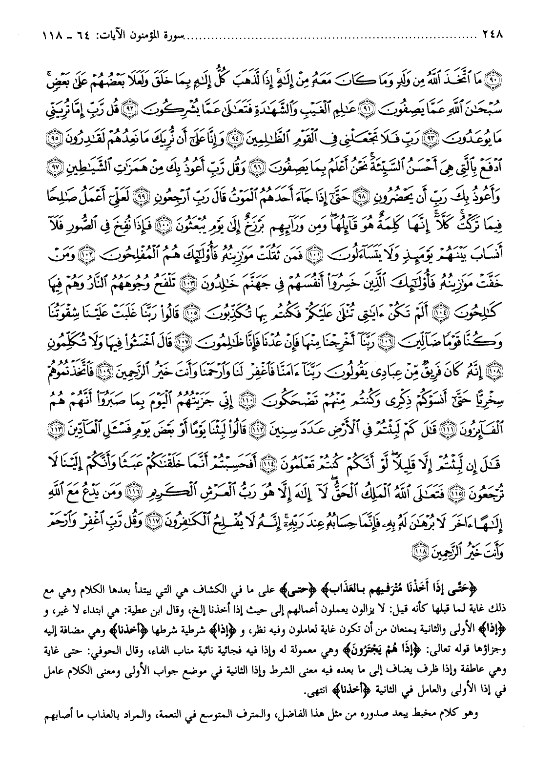 حَتَّى إِذا أَخَذْنا مُتْرَفِيهِمْ بِالْعَذابِ حَتَّى على ما في الكشاف هي التي يبتدأ بعدها الكلام وهي مع ذلك غاية لما قبلها كأنه قيل: لا يزالون يعملون أعمالهم إلى حيث إذا أخذنا إلخ، وقال ابن عطية: هي ابتداء لا غير، وإِذا الأولى والثانية يمنعان من أن تكون غاية لعاملون وفيه نظر، وإِذا شرطية شرطها أَخَذْنا وهي مضافة إليه وجزاؤها قوله تعالى: إِذا هُمْ يَجْأَرُونَ وهي معمولة له وإذا فيه فجائية نائبة مناب الفاء، وقال الحوفي: حتى غاية وهي عاطفة وإذا ظرف يضاف إلى ما بعده فيه معنى الشرط وإذا الثانية في موضع جواب الأولى ومعنى الكلام عامل في إذا الأولى والعامل في الثانية أَخَذْنا انتهى.