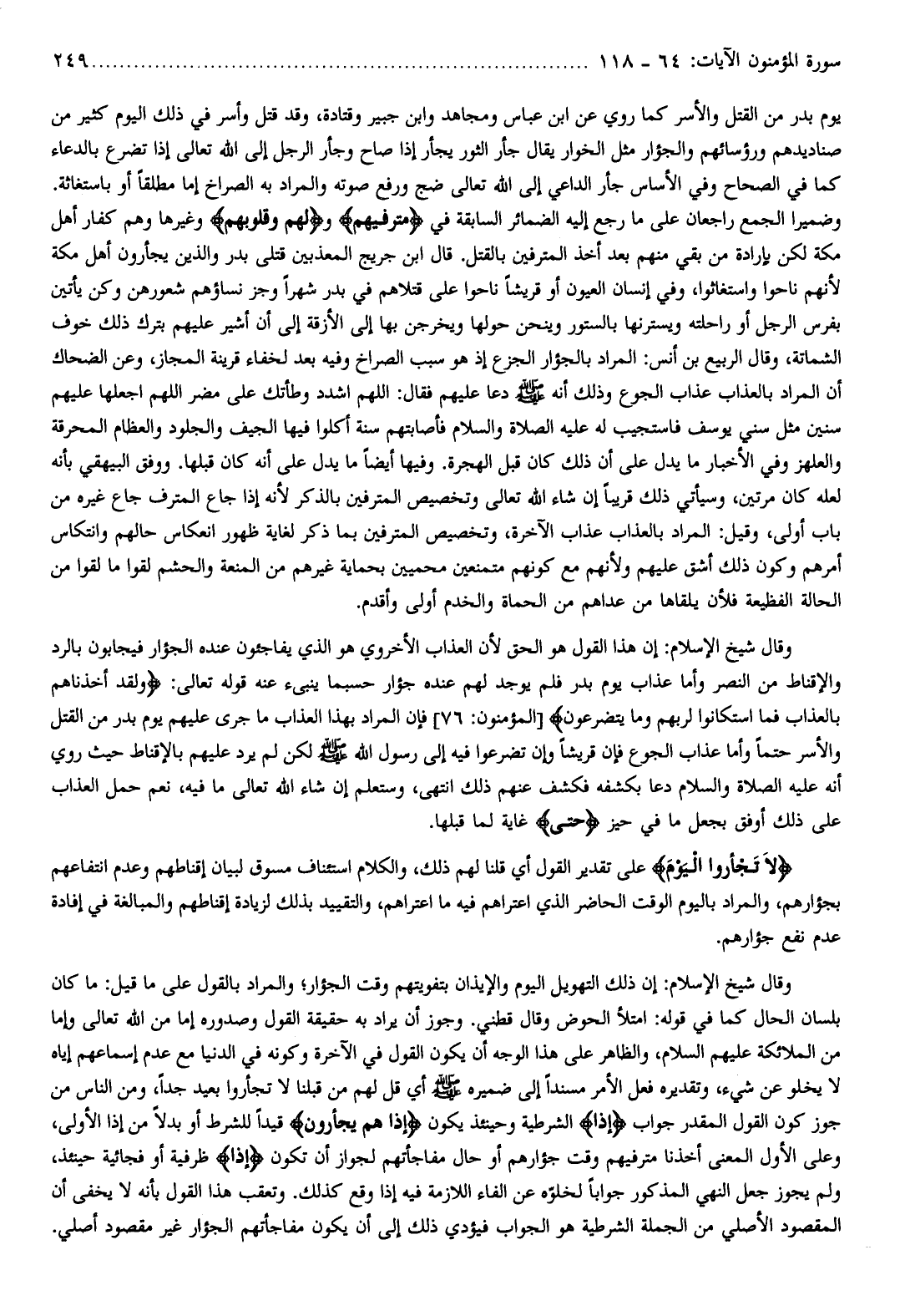 وقال شيخ الإسلام: إن هذا القول هو الحق لأن العذاب الأخروي هو الذي يفاجئون عنده الجؤار فيجابون بالرد والإقناط من النصر وأما عذاب يوم بدر فلم يوجد لهم عنده جؤار حسبما ينبىء عنه قوله تعالى: وَلَقَدْ أَخَذْناهُمْ بِالْعَذابِ فَمَا اسْتَكانُوا لِرَبِّهِمْ وَما يَتَضَرَّعُونَ [المؤمنون: 76] فإن المراد بهذا العذاب ما جرى عليهم يوم بدر من القتل والأسر حتما وأما عذاب الجوع فإن قريشا وإن تضرعوا فيه إلى رسول الله صلّى الله عليه وسلّم لكن لم يرد عليهم بالإقناط حيث