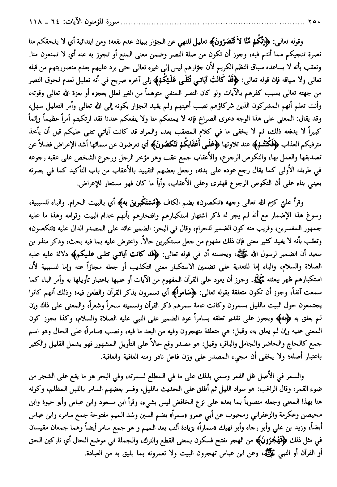 مُسْتَكْبِرِينَ بِهِ أي بالبيت الحرام. والباء للسببية، وسوغ هذا الإضمار مع أنه لم يجر له ذكر اشتهار استكبارهم وافتخارهم بأنهم خدام البيت وقوامه وهذا ما عليه جمهور المفسرين، وقريب منه كون الضمير للحرام، وقال في البحر: الضمير عائد على المصدر الدال عليه «تنكصون» وتعقب بأنه لا يفيد كثير معنى فإن ذلك مفهوم من جعل مستكبرين حالا. واعترض عليه بما فيه بحث، وذكر منذر بن سعيد أن الضمير لرسول الله صلّى الله عليه وسلّم، ويحسنه أن في قوله تعالى: قَدْ كانَتْ آياتِي تُتْلى عَلَيْكُمْ دلالة عليه عليه الصلاة والسلام، والباء إما للتعدية على تضمين الاستكبار معنى التكذيب أو جعله مجازا عنه وإما للسببية لأن استكبارهم ظهر ببعثته صلّى الله عليه وسلّم. وجوز أن يعود على القرآن المفهوم من الآيات أو عليها باعتبار تأويلها به وأمر الباء كما سمعت آنفا، وجوز أن تكون متعلقة بقوله تعالى: سامِراً أي تسمرون بذكر القرآن والطعن فيه وذلك أنهم كانوا يجتمعون حول البيت بالليل يسمرون وكانت عامة سمرهم ذكر القرآن وتسميته سحرا وشعرا، والمعنى على ذاك وإن لم يعلق به بِهِ ويجوز على تقدير تعلقه بسامرا عود الضمير على النبي عليه الصلاة والسلام، وكذا يجوز كون المعنى عليه وإن لم يعلق به، وقيل: هي متعلقة بتهجرون وفيه من البعد ما فيه، ونصب «سامرا» على الحال وهو اسم جمع كالحاج والحاضر والجامل والباقر، وقيل: هو مصدر وقع حالا على التأويل المشهور فهو يشمل القليل والكثير باعتبار أصله ولا يخفى أن مجيء المصدر على وزن فاعل نادر ومنه العافية والعاقبة.