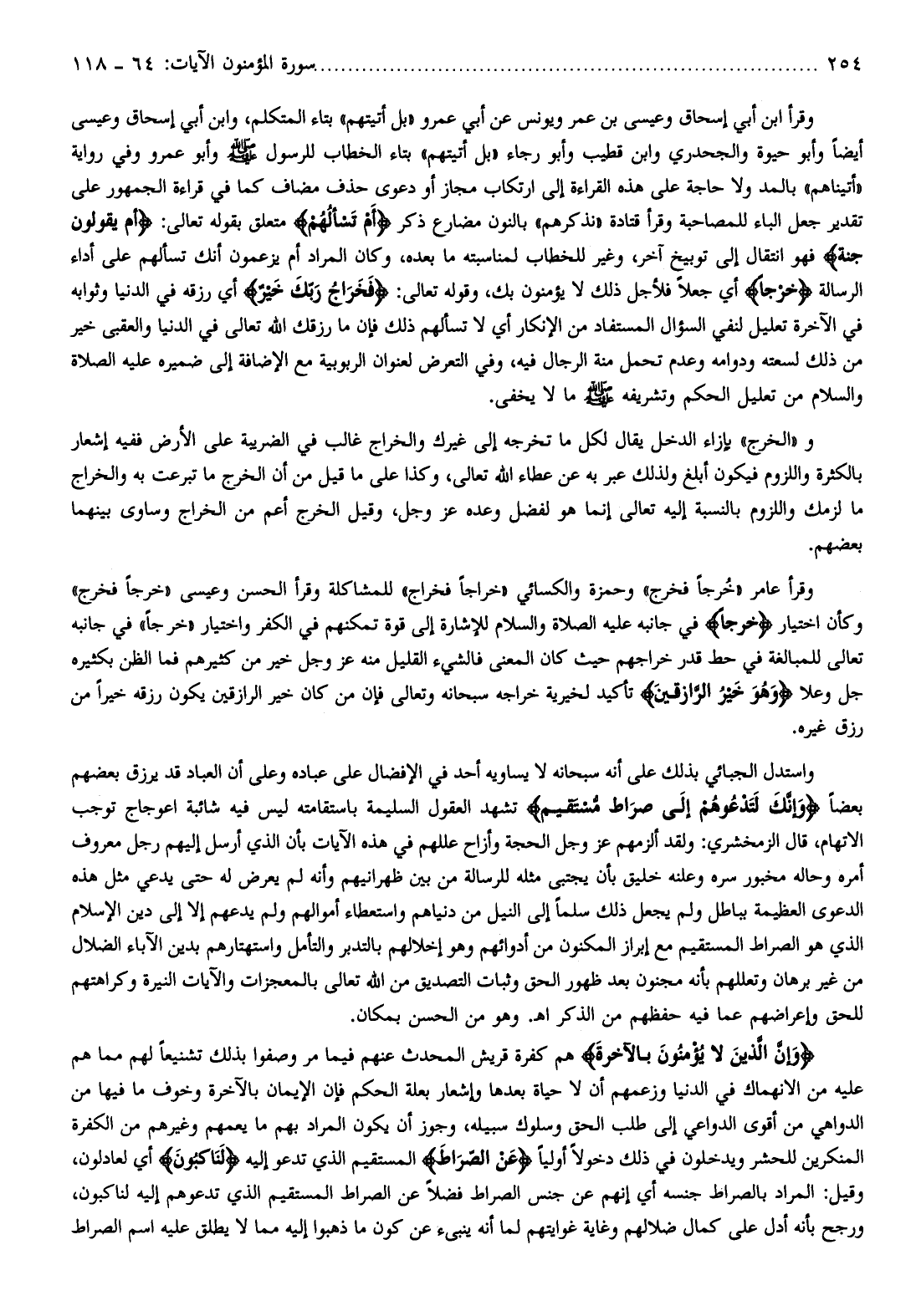 واستدل الجبائي بذلك على أنه سبحانه لا يساويه أحد في الإفضال على عباده وعلى أن العباد قد يرزق بعضهم بعضا وَإِنَّكَ لَتَدْعُوهُمْ إِلى صِراطٍ مُسْتَقِيمٍ تشهد العقول السليمة باستقامته ليس فيه شائبة اعوجاج توجب الاتهام، قال الزمخشري: ولقد ألزمهم عز وجل الحجة وأزاح عللهم في هذه الآيات بأن الذي أرسل إليهم رجل معروف أمره وحاله مخبور سره وعلنه خليق بأن يجتبى مثله للرسالة من بين ظهرانيهم وأنه لم يعرض له حتى يدعي مثل هذه الدعوى العظيمة بباطل ولم يجعل ذلك سلما إلى النيل من دنياهم واستعطاء أموالهم ولم يدعهم إلا إلى دين الإسلام الذي هو الصراط المستقيم مع إبراز المكنون من أدوائهم وهو إخلالهم بالتدبر والتأمل واستهتارهم بدين الآباء الضلال من غير برهان وتعللهم بأنه مجنون بعد ظهور الحق وثبات التصديق من الله تعالى بالمعجزات والآيات النيرة وكراهتهم للحق وإعراضهم عما فيه حفظهم من الذكر اهـ. وهو من الحسن بمكان.