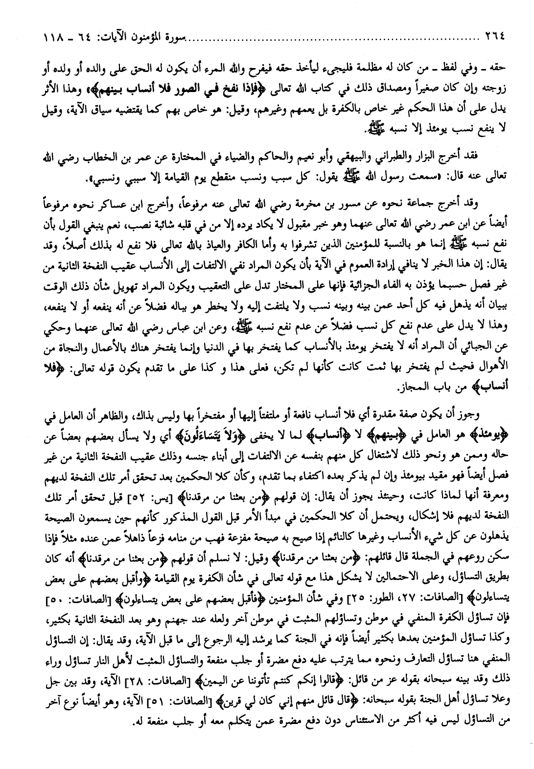 ومصداق ذلك في كتاب الله تعالى فَإِذا نُفِخَ فِي الصُّورِ فَلا أَنْسابَ بَيْنَهُمْ» وهذا الأثر يدل على أن هذا الحكم غير خاص بالكفرة بل يعمهم وغيرهم، وقيل: هو خاص بهم كما يقتضيه سياق الآية، وقيل لا ينفع نسب يومئذ إلا نسبه صلّى الله عليه وسلّم.