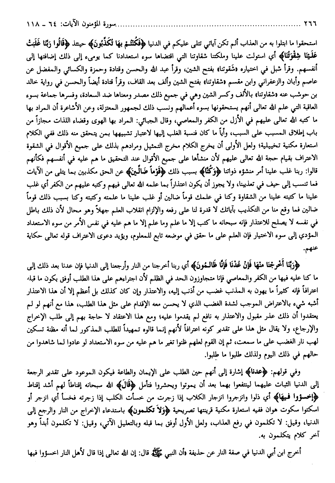 استحقوا ما ابتلوا به من العذاب ألم تكن آياتي تتلى عليكم في الدنيا فَكُنْتُمْ بِها تُكَذِّبُونَ حينئذ قالُوا رَبَّنا غَلَبَتْ عَلَيْنا شِقْوَتُنا أي استولت علينا وملكتنا شقاوتنا التي اقتضاها سوء استعدادنا كما يومىء إلى ذلك إضافتها إلى أنفسهم. وقرأ شبل في اختياره «شقوتنا» بفتح الشين، وقرأ عبد الله والحسن وقتادة وحمزة والكسائي والمفضل عن عاصم وأبان والزعفراني وابن مقسم «شقاوتنا» بفتح الشين وألف بعد القاف، وقرأ قتادة أيضا والحسن في رواية خالد بن حوشب عنه «شقاوتنا» بالألف وكسر الشين وهي في جميع ذلك مصدر ومعناها ضد السعادة، وفسرها جماعة بسوء العاقبة التي علم الله تعالى أنهم يستحقونها بسوء أعمالهم ونسب ذلك لجمهور المعتزلة، وعن الأشاعرة أن المراد بها ما كتبه الله تعالى عليهم في الأزل من الكفر والمعاصي، وقال الجبائي: المراد بها الهوى وقضاء اللذات مجازا من باب إطلاق المسبب على السبب، وأيا ما كان فنسبة الغلب إليها لاعتبار تشبيهها بمن يتحقق منه ذلك ففي الكلام استعارة مكنية تخييلية ولعل الأولى أن يخرج الكلام مخرج التمثيل ومرادهم بذلك على جميع الأقوال في الشقوة الاعتراف بقيام حجة الله تعالى عليهم لأن منشأها على جميع الأقوال عند التحقيق ما هم عليه في أنفسهم فكأنهم قالوا: ربنا غلب علينا أمر منشؤه ذواتنا وَكُنَّا بسبب ذلك قَوْماً ضالِّينَ عن الحق مكذبين بما يتلى من الآيات فما تنسب إلى حيف في تعذيبنا، ولا يجوز أن يكون اعتذارا بما علمه الله تعالى فيهم وكتبه عليهم من الكفر أي غلب علينا ما كتبته علينا من الشقاوة وكنا في علمك قوما ضالين أو غلب علينا ما علمته وكتبته وكنا بسبب ذلك قوما ضالين فما وقع منا من التكذيب بآياتك لا قدرة لنا على رفعه والإلزام انقلاب العلم جهلا وهو محال لأن ذلك باطل في نفسه لا يصلح للاعتذار فإنه سبحانه ما كتب إلا ما علم وما علم إلا ما هم عليه في نفس الأمر من سوء الاستعداد المؤدي إلى سوء الاختيار فإن العلم على ما حقق في موضعه تابع للمعلوم، ويؤيد دعوى الاعتراف قوله تعالى حكاية عنهم.