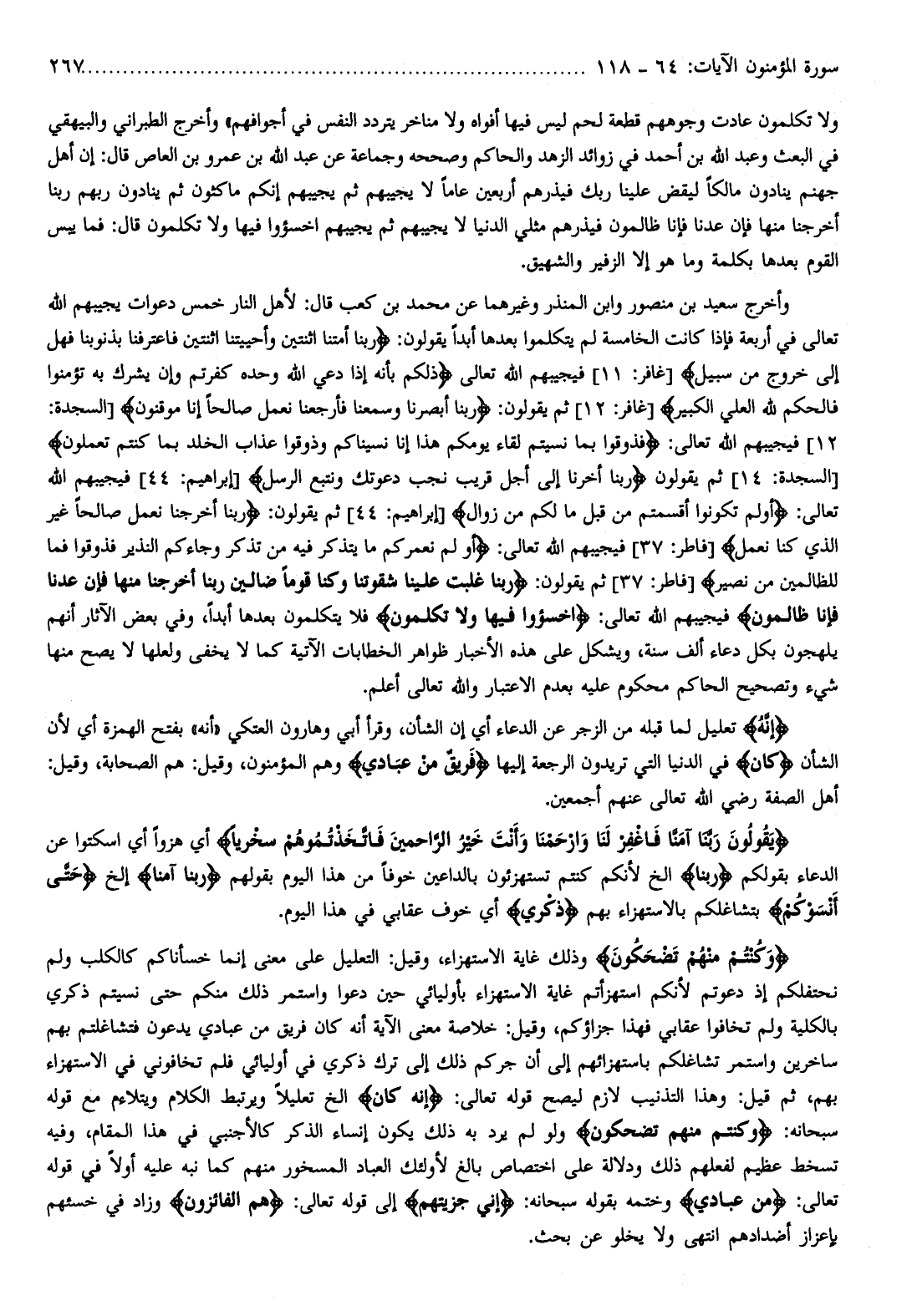 12] فيجيبهم الله تعالى: فَذُوقُوا بِما نَسِيتُمْ لِقاءَ يَوْمِكُمْ هذا إِنَّا نَسِيناكُمْ وَذُوقُوا عَذابَ الْخُلْدِ بِما كُنْتُمْ تَعْمَلُونَ [السجدة: 14] ثم يقولون رَبَّنا أَخِّرْنا إِلى أَجَلٍ قَرِيبٍ نُجِبْ دَعْوَتَكَ وَنَتَّبِعِ الرُّسُلَ [إبراهيم: 44] فيجيبهم الله تعالى: أَوَلَمْ تَكُونُوا أَقْسَمْتُمْ مِنْ قَبْلُ ما لَكُمْ مِنْ زَوالٍ [إبراهيم: 44] ثم يقولون: رَبَّنا أَخْرِجْنا نَعْمَلْ صالِحاً غَيْرَ الَّذِي كُنَّا نَعْمَلُ [فاطر: 37] فيجيبهم الله تعالى: أَوَلَمْ نُعَمِّرْكُمْ ما يَتَذَكَّرُ فِيهِ مَنْ تَذَكَّرَ وَجاءَكُمُ النَّذِيرُ فَذُوقُوا فَما لِلظَّالِمِينَ مِنْ نَصِيرٍ [فاطر: 37] ثم يقولون: رَبَّنا غَلَبَتْ عَلَيْنا شِقْوَتُنا وَكُنَّا قَوْماً ضالِّينَ رَبَّنا أَخْرِجْنا مِنْها فَإِنْ عُدْنا فَإِنَّا ظالِمُونَ فيجيبهم الله تعالى: اخْسَؤُا فِيها وَلا تُكَلِّمُونِ فلا يتكلمون بعدها أبدا، وفي بعض الآثار أنهم يلهجون بكل دعاء ألف سنة، ويشكل على هذه الأخبار ظواهر الخطابات الآتية كما لا يخفى ولعلها لا يصح منها شيء وتصحيح الحاكم محكوم عليه بعدم الاعتبار والله تعالى أعلم.