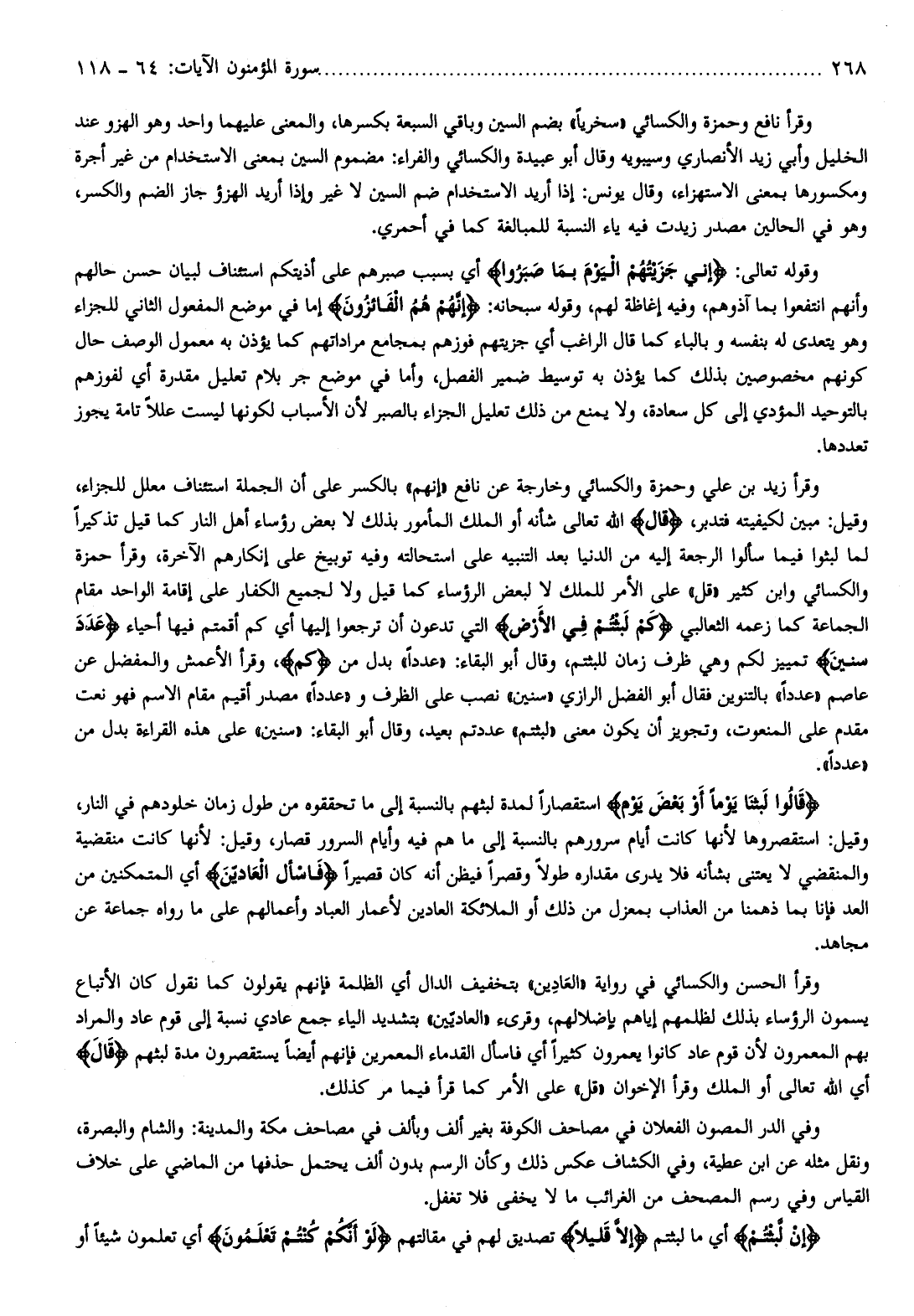 وقرأ زيد بن علي وحمزة والكسائي وخارجة عن نافع «إنهم» بالكسر على أن الجملة استئناف معلل للجزاء، وقيل: مبين لكيفيته فتدبر، قالَ الله تعالى شأنه أو الملك المأمور بذلك لا بعض رؤساء أهل النار كما قيل تذكيرا لما لبثوا فيما سألوا الرجعة إليه من الدنيا بعد التنبيه على استحالته وفيه توبيخ على إنكارهم الآخرة، وقرأ حمزة والكسائي وابن كثير «قل» على الأمر للملك لا لبعض الرؤساء كما قيل ولا لجميع الكفار على إقامة الواحد مقام الجماعة كما زعمه الثعالبي كَمْ لَبِثْتُمْ فِي الْأَرْضِ التي تدعون أن ترجعوا إليها أي كم أقمتم فيها أحياء عَدَدَ سِنِينَ تمييز لكم وهي ظرف زمان للبثتم، وقال أبو البقاء: «عددا» بدل من كَمْ، وقرأ الأعمش والمفضل عن عاصم «عددا» بالتنوين فقال أبو الفضل الرازي «سنين» نصب على الظرف و «عددا» مصدر أقيم مقام الاسم فهو نعت مقدم على المنعوت، وتجويز أن يكون معنى «لبثتم» عددتم بعيد، وقال أبو البقاء: «سنين» على هذه القراءة بدل من «عددا» .