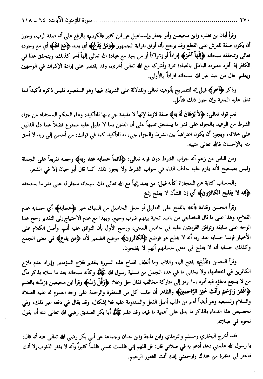 وقرأ الحسن «يفلح» بفتح الياء واللام، وما ألطف افتتاح هذه السورة بتقدير فلاح المؤمنين وإيراد عدم فلاح الكافرين في اختتامها، ولا يخفى ما في هذه الجمل من تسلية رسول الله صلّى الله عليه وسلّم وكأنه سبحانه بعد ما سلاه بذكر مآل من لا ينجع دعاؤه فيه أمره بما يرمز إلى متاركة مخالفيه فقال جل وعلا: وَقُلْ رَبِّ وقرأ ابن محيصن «ربّ» بالضم اغْفِرْ وَارْحَمْ وَأَنْتَ خَيْرُ الرَّاحِمِينَ والظاهر أن طلب كل من المغفرة والرحمة على وجه العموم له عليه الصلاة والسلام ولمتبعيه وهو أيضا أعم من طلب أصل الفعل والمداومة عليه فلا إشكال، وقد يقال في دفعه غير ذلك، وفي تخصيص هذا الدعاء بالذكر ما يدل على أهمية ما فيه، وقد علم صلّى الله عليه وسلّم أبا بكر الصديق رضي الله تعالى عنه أن يقول نحوه في صلاته.
