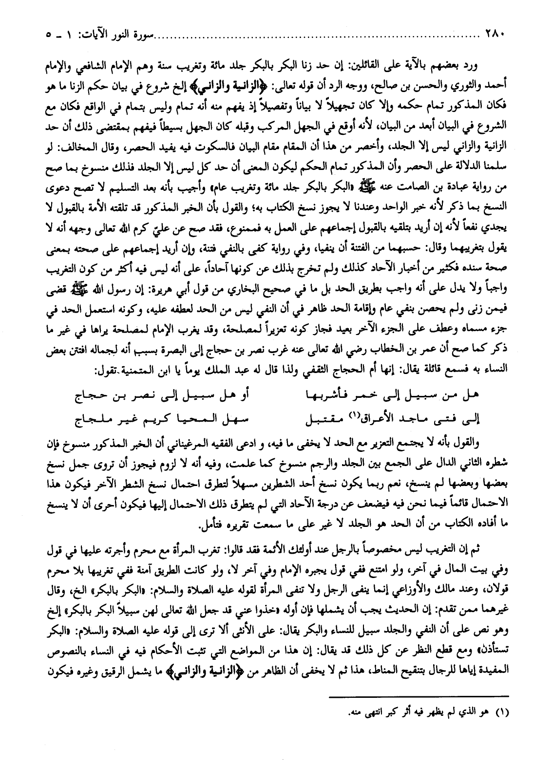 ورد بعضهم بالآية على القائلين: إن حد زنا البكر بالبكر جلد مائة وتغريب سنة وهم الإمام الشافعي والإمام أحمد والثوري والحسن بن صالح، ووجه الرد أن قوله تعالى: الزَّانِيَةُ وَالزَّانِي إلخ شروع في بيان حكم الزنا ما هو فكان المذكور تمام حكمه وإلا كان تجهيلا لا بيانا وتفصيلا إذ يفهم منه أنه تمام وليس بتمام في الواقع فكان مع الشروع في البيان أبعد من البيان، لأنه أوقع في الجهل المركب وقبله كان الجهل بسيطا فيفهم بمقتضى ذلك أن حد الزانية والزاني ليس إلا الجلد، وأخصر من هذا أن المقام مقام البيان فالسكوت فيه يفيد الحصر، وقال المخالف: لو سلمنا الدلالة على الحصر وأن المذكور تمام الحكم ليكون المعنى أن حد كل ليس إلا الجلد فذلك منسوخ بما صح من