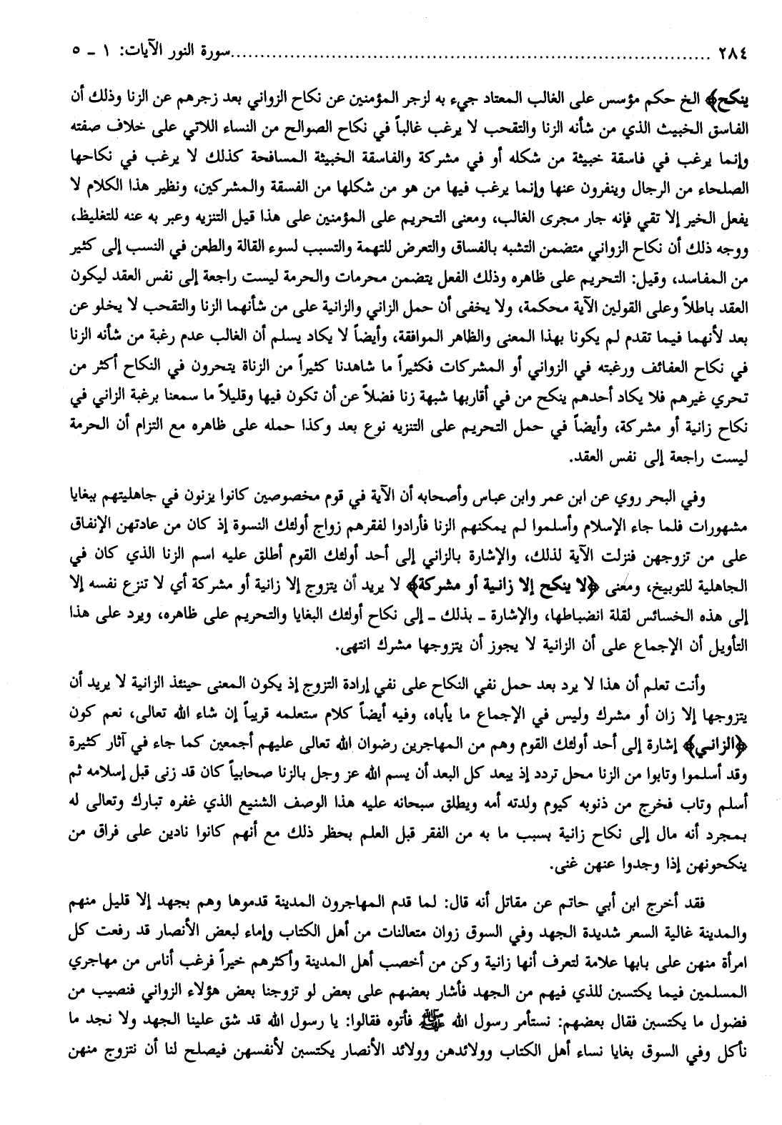 وفي البحر روي عن ابن عمر وابن عباس وأصحابه أن الآية في قوم مخصوصين كانوا يزنون في جاهليتهم ببغايا مشهورات فلما جاء الإسلام وأسلموا لم يمكنهم الزنا فأرادوا لفقرهم زواج أولئك النسوة إذ كان من عادتهن الإنفاق على من تزوجهن فنزلت الآية لذلك، والإشارة بالزاني إلى أحد أولئك القوم أطلق عليه اسم الزنا الذي كان في الجاهلية للتوبيخ، ومعنى لا يَنْكِحُ إِلَّا زانِيَةً أَوْ مُشْرِكَةً لا يريد أن يتزوج إلا زانية أو مشركة أي لا تنزع نفسه إلا إلى هذه الخسائس لقلة انضباطها، والإشارة- بذلك- إلى نكاح أولئك البغايا والتحريم على ظاهره، ويرد على هذا التأويل أن الإجماع على أن الزانية لا يجوز أن يتزوجها مشرك انتهى.