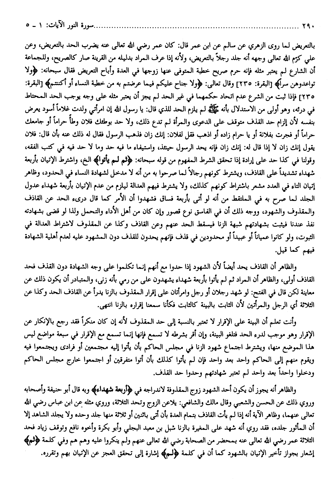 235] فإذا ثبت من الشرع عدم اتحاد حكمهما في غير الحد لم يجز أن يعتبر مثله على وجه يوجب الحد المحتاط في درئه، وهو أولى من الاستدلال بأنه صلّى الله عليه وسلّم لم يلزم الحد للذي قال: يا رسول الله إن امرأتي ولدت غلاما أسود يعرض بنفسه لأن إلزام حد القذف متوقف على الدعوى والمرأة لم تدع ذلك، ولا حد بوطئك فلان وطأ حراما أو جامعك حراما أو فجرت بفلانة أو يا حرام زاده أو اذهب فقل لفلان: إنك زان فذهب الرسول فقال له ذلك عنه بأن قال: فلان يقول إنك زان لا إذا قال له: إنك زان فإنه يحد الرسول حينئذ، واستيفاء ما فيه حد وما لا حد فيه في كتب الفقه، وقولنا في كذا حد على إرادة إذا تحقق الشرط المفهوم من قوله سبحانه: ثُمَّ لَمْ يَأْتُوا إلخ، واشترط الإتيان بأربعة شهداء تشديدا على القاذف، ويشترط كونهم رجالا لما صرحوا به من أنه لا مدخل لشهادة النساء في الحدود، وظاهر إتيان التاء في العدد مشعر باشتراط كونهم كذلك، ولا يشترط فيهم العدالة ليلزم من عدم الإتيان بأربعة شهداء عدول الجلد لما صرح به في الملتقط من أنه لو أتى بأربعة فساق فشهدوا أن الأمر كما قال درىء الحد عن القاذف والمقذوف والشهود، ووجه ذلك أن في الفاسق نوع قصور وإن كان من أهل الأداء والتحمل ولذا لو قضى بشهادته نفذ عندنا فيثبت بشهادتهم شبهة الزنا فيسقط الحد عنهم وعن القاذف وكذا عن المقذوف لاشتراط العدالة في الثبوت، ولو كانوا عميانا أو عبيدا أو محدودين في قذف فإنهم يحدون للقذف دون المشهود عليه لعدم أهلية الشهادة فيهم كما قيل.