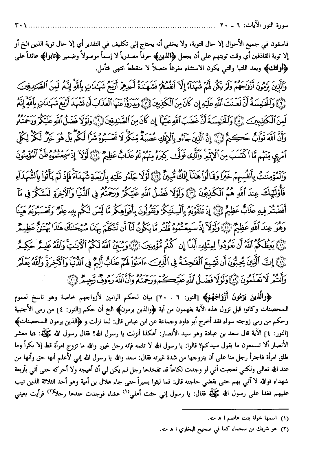 وَالَّذِينَ يَرْمُونَ أَزْواجَهُمْ [النور: 6. 20] بيان لحكم الرامين لأزواجهم خاصة وهو ناسخ لعموم المحصنات وكانوا قبل نزول هذه الآية يفهمون من آية وَالَّذِينَ يَرْمُونَ إلخ أن حكم [النور: 4] من رمى الأجنبية وحكم من رمى زوجته سواء