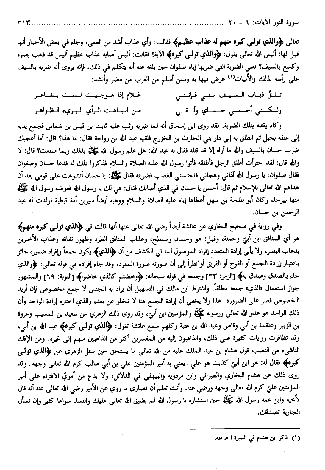 تعالى وَالَّذِي تَوَلَّى كِبْرَهُ مِنْهُمْ لَهُ عَذابٌ عَظِيمٌ فقالت: وأي عذاب أشد من العمى، وجاء في بعض الأخبار أنها قيل لها: أليس الله تعالى يقول: وَالَّذِي تَوَلَّى كِبْرَهُ الآية؟ فقالت: أليس أصابه عذاب عظيم أليس قد ذهب بصره وكسع بالسيف؟ تعني الضربة التي ضربها إياه صفوان حين بلغه عنه أنه يتكلم في ذلك، فإنه يروى أنه ضربه بالسيف على رأسه لذلك والأبيات (¬1) عرض فيها به وبمن أسلم من العرب من مضر وأنشد: