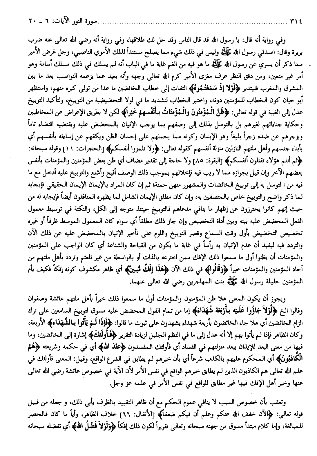 وفي رواية أنه قال: يا رسول الله قد قال الناس وقد حل لك طلاقها، وفي رواية أنه رضي الله تعالى عنه ضرب بريرة وقال: اصدقي رسول الله صلّى الله عليه وسلّم وليس في ذلك شيء مما يصلح مستندا لذلك الأموي الناصبي، وجل غرض الأمير مما ذكر أن يسري عن رسول الله صلّى الله عليه وسلّم ما هو فيه من الغم غاية ما في الباب أنه لم يسلك في ذلك مسلك أسامة وهو أمر غير متعين، ومن دقق النظر عرف مغزى الأمير كرم الله تعالى وجهه وأنه بعيد عما يزعمه النواصب بعد ما بين المشرق والمغرب فليتدبر لَوْلا إِذْ سَمِعْتُمُوهُ التفات إلى خطاب الخائضين ما عدا من تولى كبره منهم، واستظهر أبو حيان كون الخطاب للمؤمنين دونه، واختير الخطاب لتشديد ما في لولا التحضيضية من التوبيخ، ولتأكيد التوبيخ عدل إلى الغيبة في قوله تعالى: ظَنَّ الْمُؤْمِنُونَ وَالْمُؤْمِناتُ بِأَنْفُسِهِمْ خَيْراً لكن لا بطريق الإعراض عن المخاطبين وحكاية جناياتهم لغيرهم بل بالتوسل بذلك إلى وصفهم بما يوجب الإتيان بالمحضض عليه ويقتضيه اقتضاء تاما ويزجرهم عن ضده زجرا بليغا وهو الإيمان وكونه مما يحملهم على إحسان الظن ويكفهم عن إساءته بأنفسهم أي بأبناء جنسهم وأهل ملتهم النازلين منزلة أنفسهم كقوله تعالى: وَلا تَلْمِزُوا أَنْفُسَكُمْ [الحجرات: 11] وقوله سبحانه:
