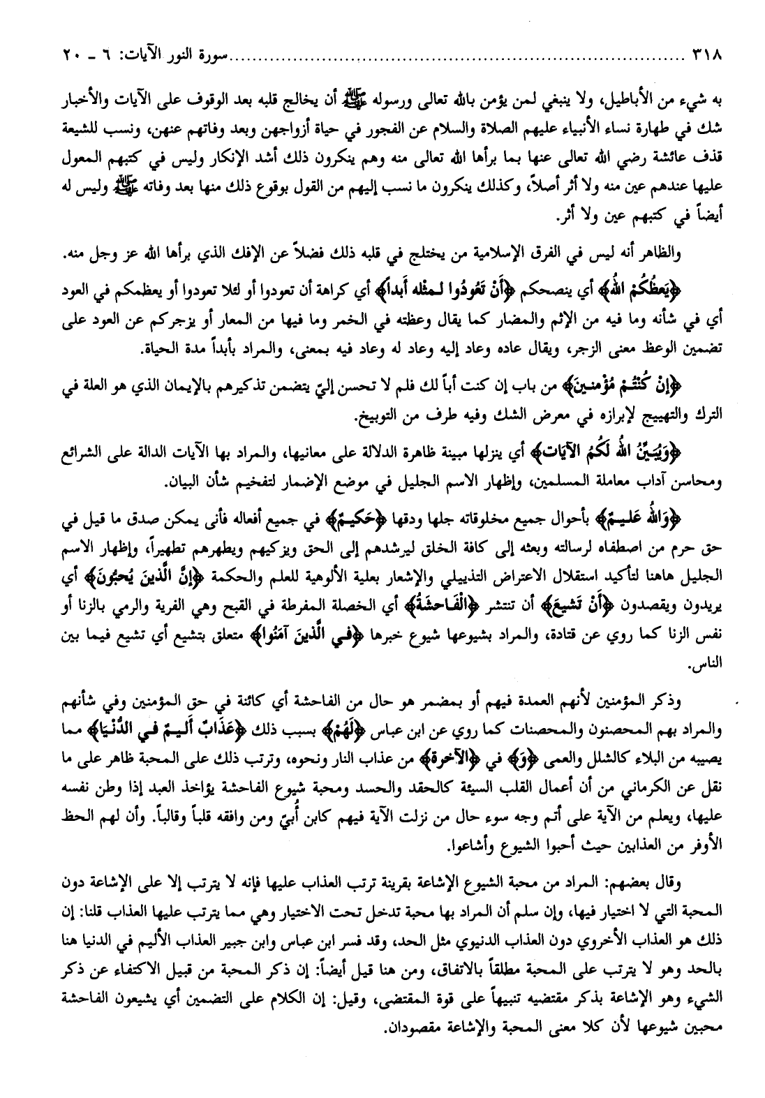 به شيء من الأباطيل، ولا ينبغي لمن يؤمن بالله تعالى ورسوله صلّى الله عليه وسلّم أن يخالج قلبه بعد الوقوف على الآيات والأخبار شك في طهارة نساء الأنبياء عليهم الصلاة والسلام عن الفجور في حياة أزواجهن وبعد وفاتهم عنهن، ونسب للشيعة قذف عائشة رضي الله تعالى عنها بما برأها الله تعالى منه وهم ينكرون ذلك أشد الإنكار وليس في كتبهم المعول عليها عندهم عين منه ولا أثر أصلا، وكذلك ينكرون ما نسب إليهم من القول بوقوع ذلك منها بعد وفاته صلّى الله عليه وسلّم وليس له أيضا في كتبهم عين ولا أثر.