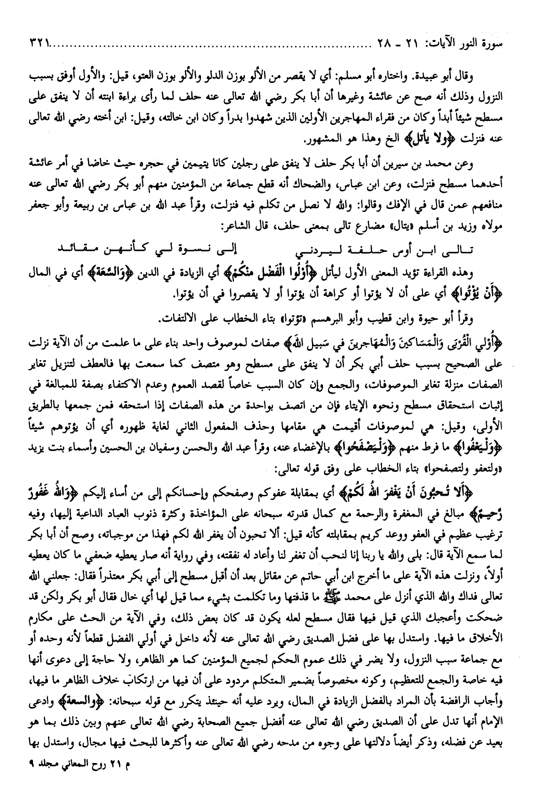 وهذه القراءة تؤيد المعنى الأول ليأتل أُولُوا الْفَضْلِ مِنْكُمْ أي الزيادة في الدين وَالسَّعَةِ أي في المال أَنْ يُؤْتُوا أي على أن لا يؤتوا أو كراهة أن يؤتوا أو لا يقصروا في أن يؤتوا.