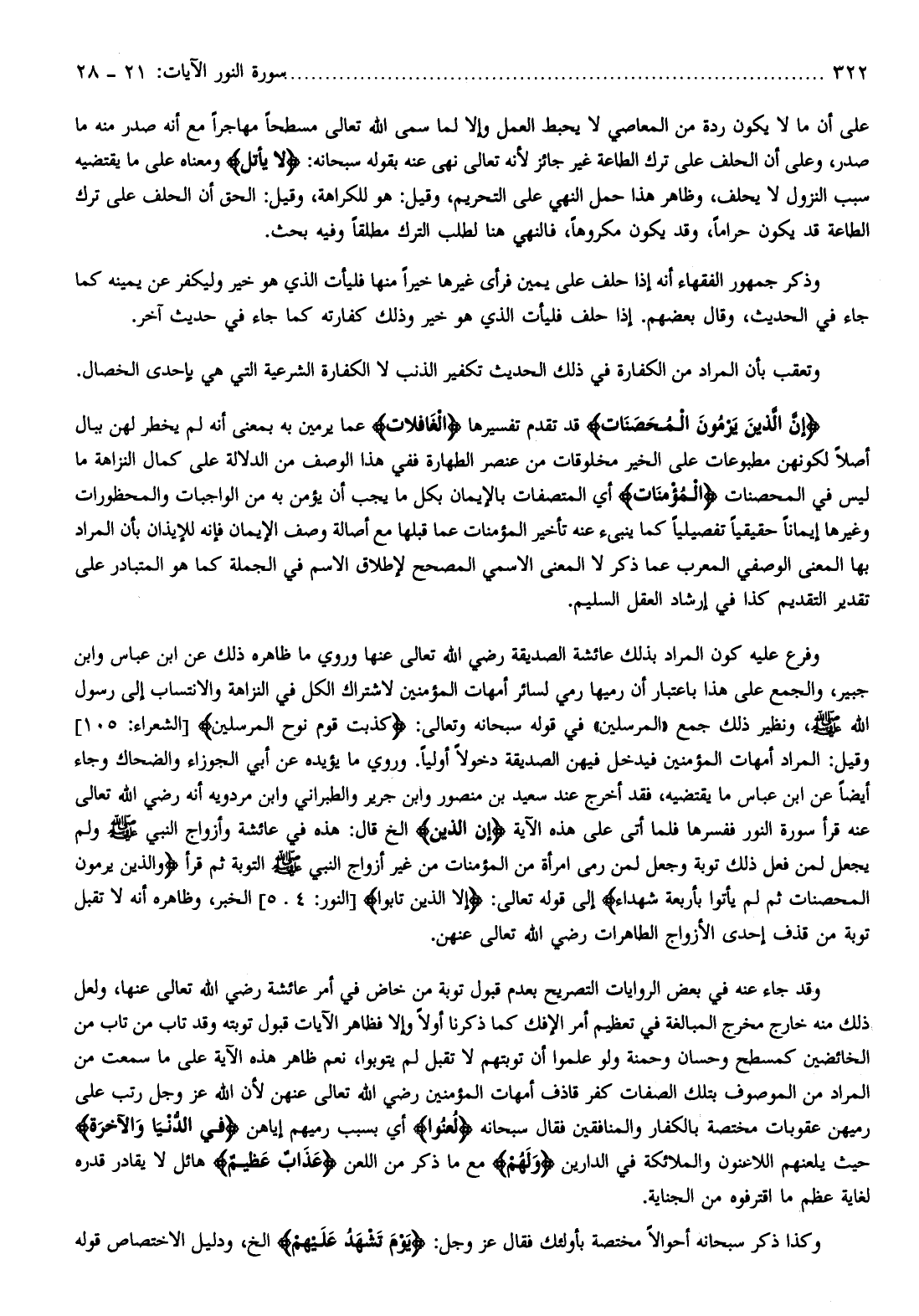 إِنَّ الَّذِينَ يَرْمُونَ الْمُحْصَناتِ قد تقدم تفسيرها الْغافِلاتِ عما يرمين به بمعنى أنه لم يخطر لهن ببال أصلا لكونهن مطبوعات على الخير مخلوقات من عنصر الطهارة ففي هذا الوصف من الدلالة على كمال النزاهة ما ليس في المحصنات الْمُؤْمِناتِ أي المتصفات بالإيمان بكل ما يجب أن يؤمن به من الواجبات والمحظورات وغيرها إيمانا حقيقيا تفصيليا كما ينبىء عنه تأخير المؤمنات عما قبلها مع أصالة وصف الإيمان فإنه للإيذان بأن المراد بها المعنى الوصفي المعرب عما ذكر لا المعنى الاسمي المصحح لإطلاق الاسم في الجملة كما هو المتبادر على تقدير التقديم كذا في إرشاد العقل السليم.
