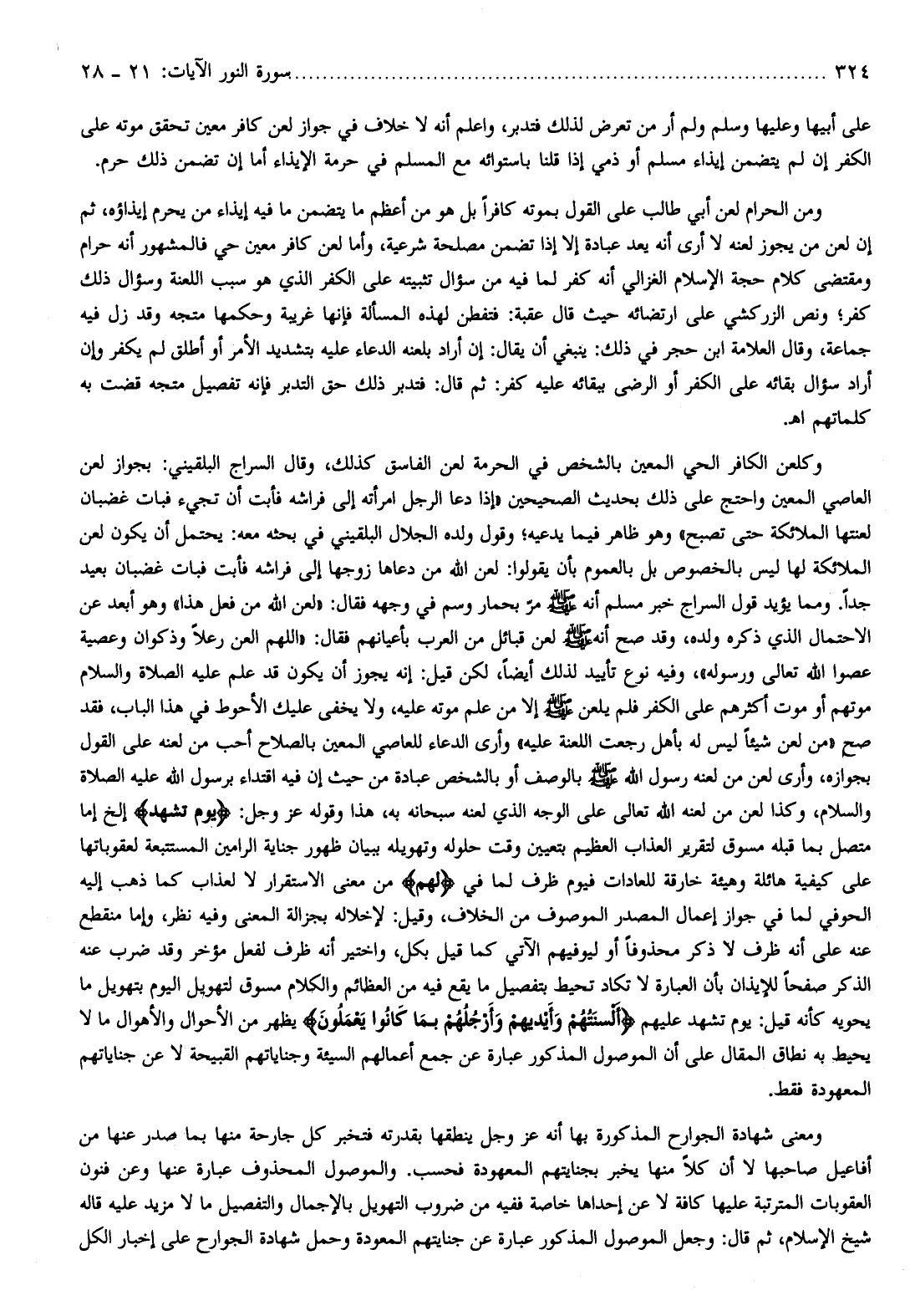 وأرى الدعاء للعاصي المعين بالصلاح أحب من لعنه على القول بجوازه، وأرى لعن من لعنه رسول الله صلّى الله عليه وسلّم بالوصف أو بالشخص عبادة من حيث إن فيه اقتداء برسول الله عليه الصلاة والسلام، وكذا لعن من لعنه الله تعالى على الوجه الذي لعنه سبحانه به، هذا وقوله عز وجل: يَوْمَ تَشْهَدُ إلخ إما متصل بما قبله مسوق لتقرير العذاب العظيم بتعيين وقت حلوله وتهويله ببيان ظهور جناية الرامين المستتبعة لعقوباتها على كيفية هائلة وهيئة خارقة للعادات فيوم ظرف لما في لَهُمْ من معنى الاستقرار لا لعذاب كما ذهب إليه الحوفي لما في جواز إعمال المصدر الموصوف من الخلاف، وقيل: لإخلاله بجزالة المعنى وفيه نظر، وإما منقطع عنه على أنه ظرف لا ذكر محذوفا أو ليوفيهم الآتي كما قيل بكل، واختير أنه ظرف لفعل مؤخر وقد ضرب عنه الذكر صفحا للإيذان بأن العبارة لا تكاد تحيط بتفصيل ما يقع فيه من العظائم والكلام مسوق لتهويل اليوم بتهويل ما يحويه كأنه قيل: يوم تشهد عليهم أَلْسِنَتُهُمْ وَأَيْدِيهِمْ وَأَرْجُلُهُمْ بِما كانُوا يَعْمَلُونَ يظهر من الأحوال والأهوال ما لا يحيط به نطاق المقال على أن الموصول المذكور عبارة عن جمع أعمالهم السيئة وجناياتهم القبيحة لا عن جناياتهم المعهودة فقط.