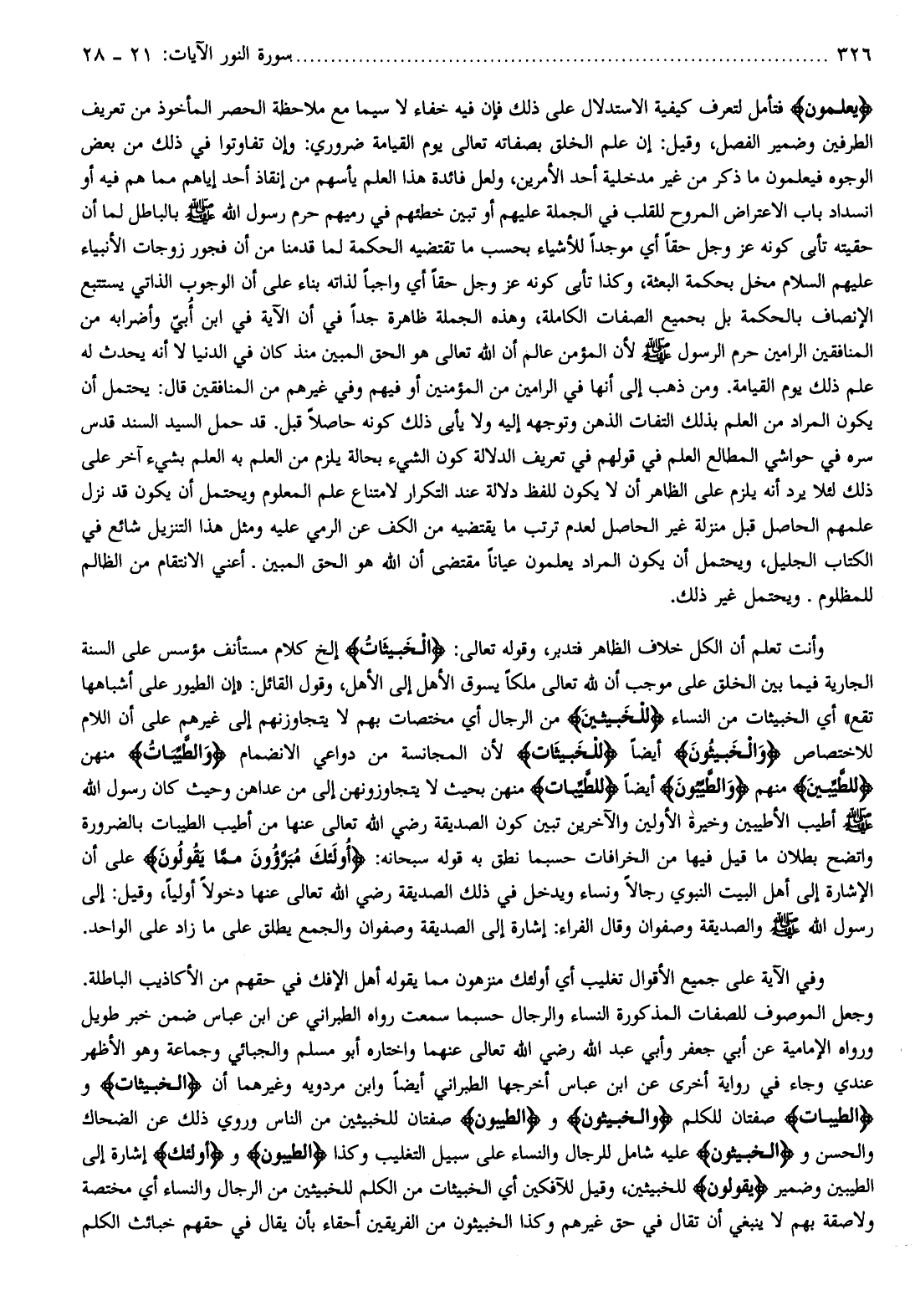 وأنت تعلم أن الكل خلاف الظاهر فتدبر، وقوله تعالى: الْخَبِيثاتُ إلخ كلام مستأنف مؤسس على السنة الجارية فيما بين الخلق على موجب أن لله تعالى ملكا يسوق الأهل إلى الأهل، وقول القائل: «إن الطيور على أشباهها تقع» أي الخبيثات من النساء لِلْخَبِيثِينَ من الرجال أي مختصات بهم لا يتجاوزنهم إلى غيرهم على أن اللام للاختصاص وَالْخَبِيثُونَ أيضا لِلْخَبِيثاتِ لأن المجانسة من دواعي الانضمام وَالطَّيِّباتُ منهن لِلطَّيِّبِينَ منهم وَالطَّيِّبُونَ أيضا لِلطَّيِّباتِ منهن بحيث لا يتجاوزونهن إلى من عداهن وحيث كان رسول الله صلّى الله عليه وسلّم أطيب الأطيبين وخيرة الأولين والآخرين تبين كون الصديقة رضي الله تعالى عنها من أطيب الطيبات بالضرورة واتضح بطلان ما قيل فيها من الخرافات حسبما نطق به قوله سبحانه: أُولئِكَ مُبَرَّؤُنَ مِمَّا يَقُولُونَ على أن الإشارة إلى أهل البيت النبوي رجالا ونساء ويدخل في ذلك الصديقة رضي الله تعالى عنها دخولا أوليا، وقيل: إلى رسول الله صلّى الله عليه وسلّم والصديقة وصفوان وقال الفراء: إشارة إلى الصديقة وصفوان والجمع يطلق على ما زاد على الواحد.