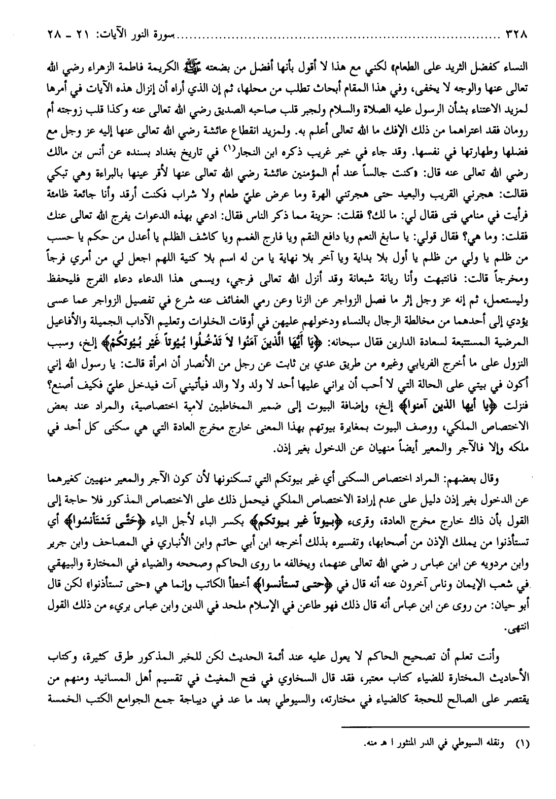 لكني مع هذا لا أقول بأنها أفضل من بضعته صلّى الله عليه وسلّم الكريمة فاطمة الزهراء رضي الله تعالى عنها والوجه لا يخفى، وفي هذا المقام أبحاث تطلب من محلها، ثم إن الذي أراه أن إنزال هذه الآيات في أمرها لمزيد الاعتناء بشأن الرسول عليه الصلاة والسلام ولجبر قلب صاحبه الصديق رضي الله تعالى عنه وكذا قلب زوجته أم رومان فقد اعتراهما من ذلك الإفك ما الله تعالى أعلم به. ولمزيد انقطاع عائشة رضي الله تعالى عنها إليه عز وجل مع فضلها وطهارتها في نفسها.