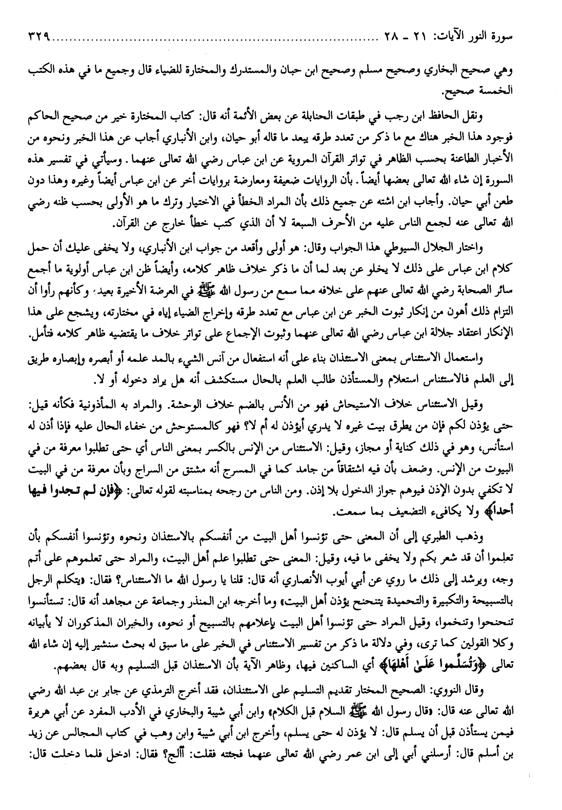 ونقل الحافظ ابن رجب في طبقات الحنابلة عن بعض الأئمة أنه قال: كتاب المختارة خير من صحيح الحاكم فوجود هذا الخبر هناك مع ما ذكر من تعدد طرقه يبعد ما قاله أبو حيان، وابن الأنباري أجاب عن هذا الخبر ونحوه من الأخبار الطاعنة بحسب الظاهر في تواتر القرآن المروية عن ابن عباس رضي الله تعالى عنهما. وسيأتي في تفسير هذه السورة إن شاء الله تعالى بعضها أيضا. بأن الروايات ضعيفة ومعارضة بروايات أخر عن ابن عباس أيضا وغيره وهذا دون طعن أبي حيان. وأجاب ابن اشته عن جميع ذلك بأن المراد الخطأ في الاختيار وترك ما هو الأولى بحسب ظنه رضي الله تعالى عنه لجمع الناس عليه من الأحرف السبعة لا أن الذي كتب خطأ خارج عن القرآن.