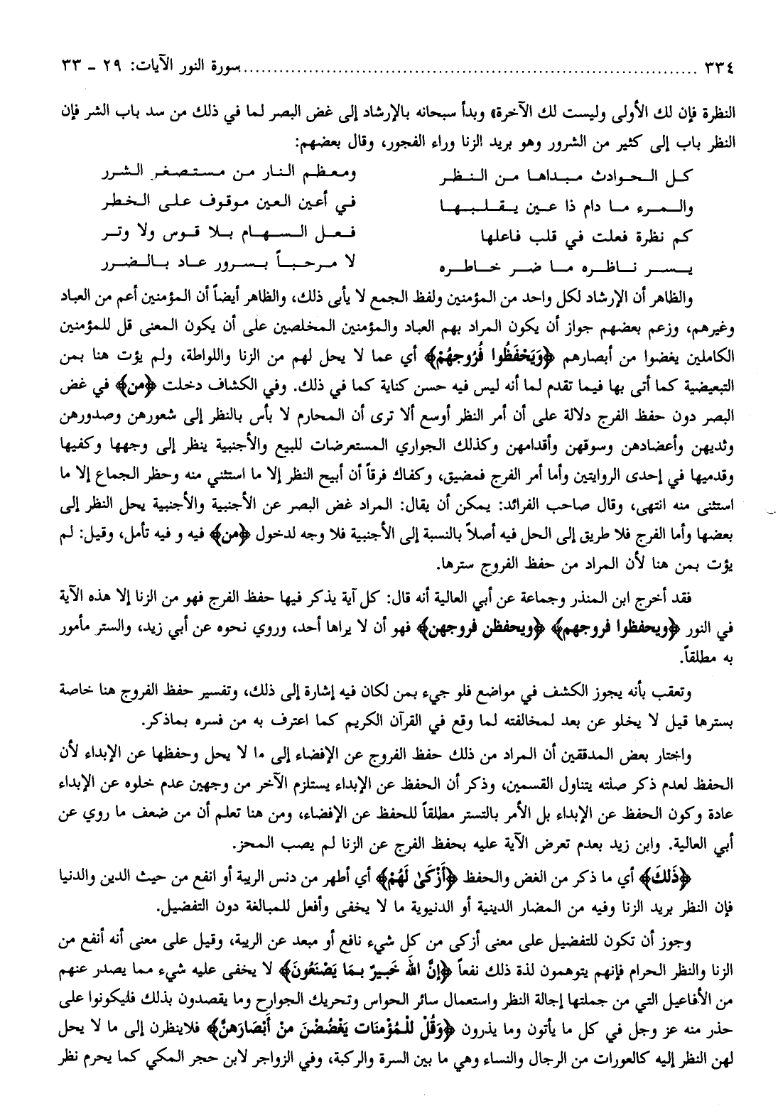 وجوز أن تكون للتفضيل على معنى أزكى من كل شيء نافع أو مبعد عن الريبة، وقيل على معنى أنه أنفع من الزنا والنظر الحرام فإنهم يتوهمون لذة ذلك نفعا إِنَّ اللَّهَ خَبِيرٌ بِما يَصْنَعُونَ لا يخفى عليه شيء مما يصدر عنهم من الأفاعيل التي من جملتها إجالة النظر واستعمال سائر الحواس وتحريك الجوارح وما يقصدون بذلك فليكونوا على حذر منه عز وجل في كل ما يأتون وما يذرون وَقُلْ لِلْمُؤْمِناتِ يَغْضُضْنَ مِنْ أَبْصارِهِنَّ فلا ينظرن إلى ما لا يحل لهن النظر إليه كالعورات من الرجال والنساء وهي ما بين السرة والركبة، وفي الزواجر لابن حجر المكي كما يحرم نظر
