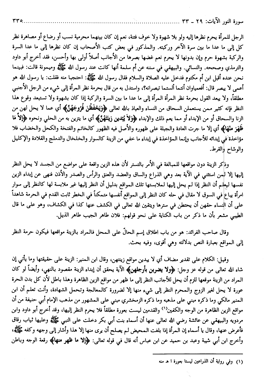 وقيل: الكلام على تقدير مضاف أي لا يبدين مواقع زينتهن، وقال ابن المنير: الزينة على حقيقتها وما يأتي إن شاء الله تعالى من قوله عز وجل: وَلا يَضْرِبْنَ بِأَرْجُلِهِنَّ الآية يحقق أن إبداء الزينة مقصود بالنهي، وأيضا لو كان المراد من الزينة موقعها للزم أن يحل للأجانب النظر إلى ما ظهر من مواقع الزين الظاهرة وهذا باطل لأن كل بدن الحرة عورة لا يحل لغير الزوج والمحرم النظر إلى شيء منها إلا لضرورة كالمعالجة وتحمل الشهادة، وأنت تعلم أن ابن المنير مالكي وما ذكره مبني على مذهبه وما ذكره الزمخشري مبني على المشهور من مذهب الإمام أبي حنيفة من أن مواقع الزين الظاهرة من الوجه والكفين (¬1) والقدمين ليست بعورة مطلقا فلا يحرم النظر إليها، وقد أخرج أبو داود وابن مردويه والبيهقي عن عائشة رضي الله تعالى عنها أن أسماء بنت أبي بكر دخلت على النبي صلّى الله عليه وسلّم وعليها ثياب رقاق فأعرض عنها، وقال يا أسماء إن المرأة إذا بلغت المحيض لم يصلح أن يرى منها إلا هذا وأشار إلى وجهه وكفه صلّى الله عليه وسلّم، وأخرج ابن أبي شيبة وعبد بن حميد عن ابن عباس أنه قال في قوله تعالى: إِلَّا ما ظَهَرَ مِنْها رقعة الوجه وباطن