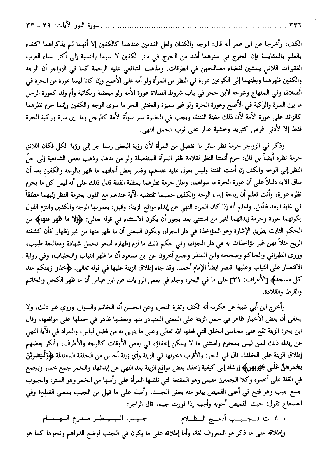 وذكر في الزواجر حرمة نظر سائر ما انفصل من المرأة لأن رؤية البعض ربما جر إلى رؤية الكل فكان اللائق حرمة نظره أيضا بل قال: حرم أئمتنا النظر لقلامة ظفر المرأة المنفصلة ولو من يدها، وذهب بعض الشافعية إلى حلّ النظر إلى الوجه والكف إن أمنت الفتنة وليس يعول عليه عندهم، وفسر بعض أجلتهم ما ظهر بالوجه والكفين بعد أن ساق الآية دليلا على أن عورة الحرة ما سواهما، وعلل حرمة نظرهما بمظنة الفتنة فدل ذلك على أنه ليس كل ما يحرم نظره عورة، وأنت تعلم أن إباحة إبداء الوجه والكفين حسبما تقتضيه الآية عندهم مع القول بحرمة النظر إليهما مطلقا في غاية البعد فتأمل. واعلم أنه إذا كان المراد النهي عن إبداء مواقع الزينة، وقيل: بعمومها الوجه والكفين والتزم القول بكونهما عورة وحرمة إبدائهما لغير من استثنى بعد يجوز أن يكون الاستثناء في قوله تعالى: إِلَّا ما ظَهَرَ مِنْها من الحكم الثابت بطريق الإشارة وهو المؤاخذة في دار الجزاء، ويكون المعنى أن ما ظهر منها من غير إظهار كأن كشفته الريح مثلا فهن غير مؤاخذات به في دار الجزاء، وفي حكم ذلك ما لزم إظهاره لنحو تحمل شهادة ومعالجة طبيب، وروى الطبراني والحاكم وصححه وابن المنذر وجمع آخرون عن ابن مسعود أن ما ظهر الثياب والجلباب، وفي رواية الاقتصار على الثياب وعليها اقتصر ايضا الإمام أحمد. وقد جاء إطلاق الزينة عليها في قوله تعالى: خُذُوا زِينَتَكُمْ عِنْدَ كُلِّ مَسْجِدٍ [الأعراف: 31] على ما في البحر، وجاء في بعض الروايات عن ابن عباس أن ما ظهر الكحل والخاتم والقرط والقلادة.