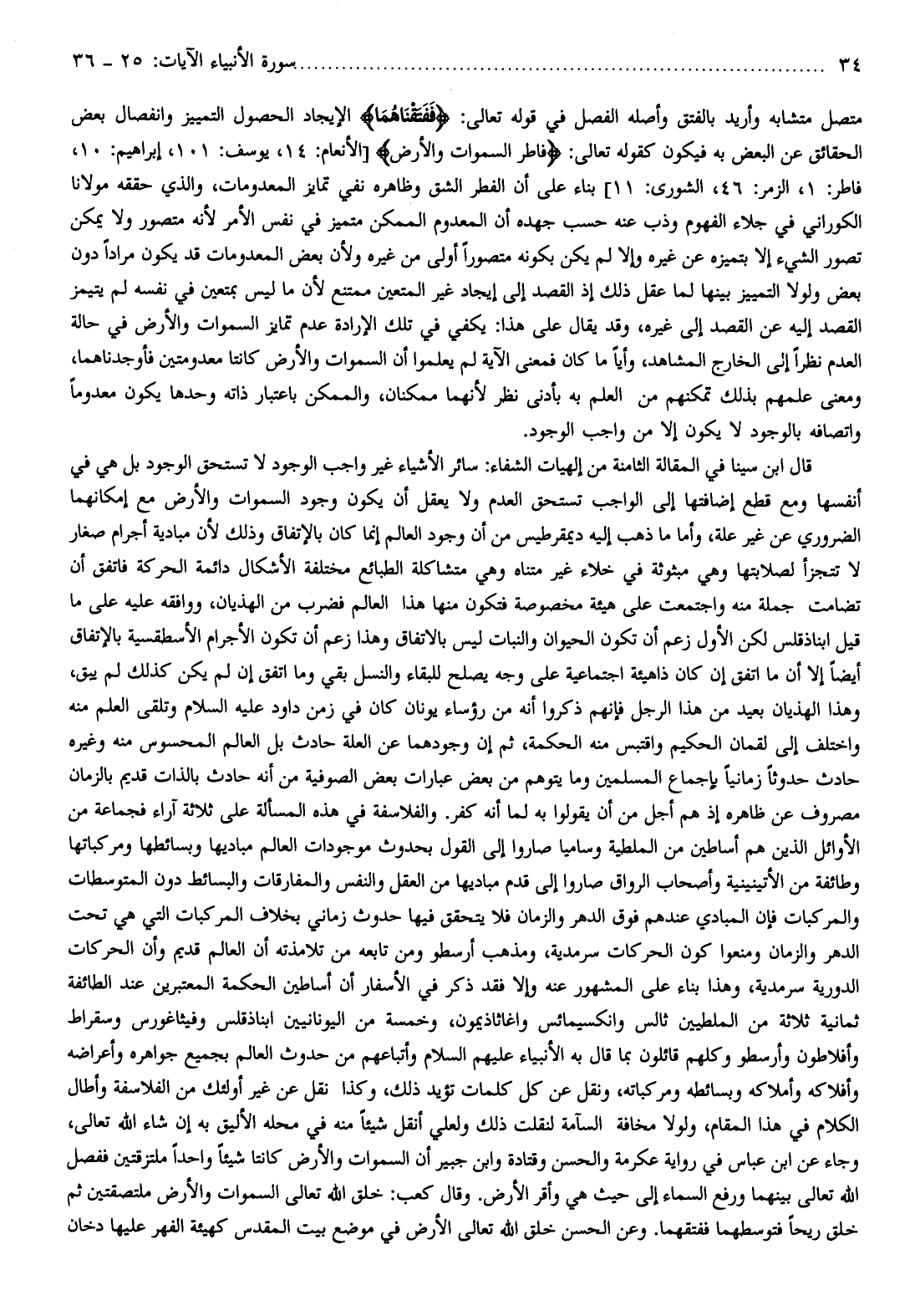 متصل متشابه وأريد بالفتق وأصله الفصل في قوله تعالى: فَفَتَقْناهُما الإيجاد الحصول التمييز وانفصال بعض الحقائق عن البعض به فيكون كقوله تعالى: فاطِرِ السَّماواتِ وَالْأَرْضِ [الأنعام: 14، يوسف: 101، إبراهيم: 10، فاطر: 1، الزمر: 46، الشورى: 11] بناء على أن الفطر الشق وظاهره نفي تمايز المعدومات، والذي حققه مولانا الكوراني في جلاء الفهوم وذب عنه حسب جهده أن المعدوم الممكن متميز في نفس الأمر لأنه متصور ولا يمكن تصور الشيء إلا بتميزه عن غيره وإلا لم يكن بكونه متصورا أولى من غيره ولأن بعض المعدومات قد يكون مرادا دون بعض ولولا التمييز بينها لما عقل ذلك إذ القصد إلى إيجاد غير المتعين ممتنع لأن ما ليس بمتعين في نفسه لم يتيمز القصد إليه عن القصد إلى غيره، وقد يقال على هذا: يكفي في تلك الإرادة عدم تمايز السموات والأرض في حالة العدم نظرا إلى الخارج المشاهد، وأيا ما كان فمعنى الآية لم يعلموا أن السموات والأرض كانتا معدومتين فأوجدناهما، ومعنى علمهم بذلك تمكنهم من العلم به بأدنى نظر لأنهما ممكنان، والممكن باعتبار ذاته وحدها يكون معدوما واتصافه بالوجود لا يكون إلا من واجب الوجود.