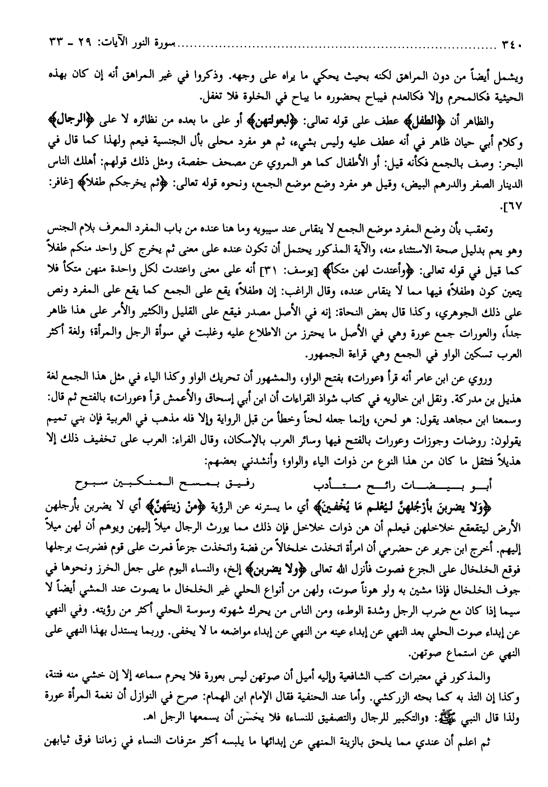 وتعقب بأن وضع المفرد موضع الجمع لا ينقاس عند سيبويه وما هنا عنده من باب المفرد المعرف بلام الجنس وهو يعم بدليل صحة الاستثناء منه، والآية المذكور يحتمل أن تكون عنده على معنى ثم يخرج كل واحد منكم طفلا كما قيل في قوله تعالى: وَأَعْتَدَتْ لَهُنَّ مُتَّكَأً [يوسف: 31] أنه على معنى واعتدت لكل واحدة منهن متكأ فلا يتعين كون «طفلا» فيها مما لا ينقاس عنده، وقال الراغب: إن «طفلا» يقع على الجمع كما يقع على المفرد ونص على ذلك الجوهري، وكذا قال بعض النحاة: إنه في الأصل مصدر فيقع على القليل والكثير والأمر على هذا ظاهر جدا، والعورات جمع عورة وهي في الأصل ما يحترز من الاطلاع عليه وغلبت في سوأة الرجل والمرأة ولغة أكثر العرب تسكين الواو في الجمع وهي قراءة الجمهور.