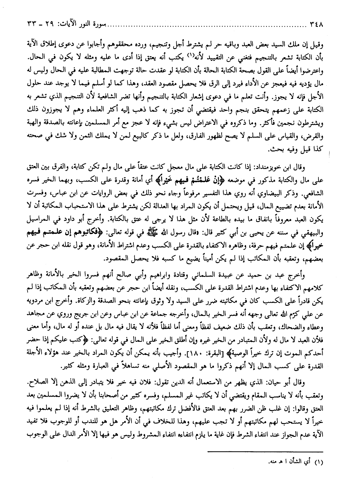 وقال ابن خويزمنداد: إذا كانت الكتابة على مال معجل كانت عتقا على مال ولم تكن كتابة، والفرق بين العتق على مال والكتابة مذكور في موضعه إِنْ عَلِمْتُمْ فِيهِمْ خَيْراً أي أمانة وقدرة على الكسب، وبهما الخير فسره الشافعي. وذكر البيضاوي أنه روي هذا التفسير مرفوعا وجاء نحو ذلك في بعض الروايات عن ابن عباس، وفسرت الأمانة بعدم تضييع المال، قيل ويحتمل أن يكون المراد بها العدالة لكن يشترط على هذا الاستحباب المكاتبة أن لا يكون العبد معروفا بانفاق ما بيده بالطاعة لأن مثل هذا لا يرجى له عتق بالكتابة.