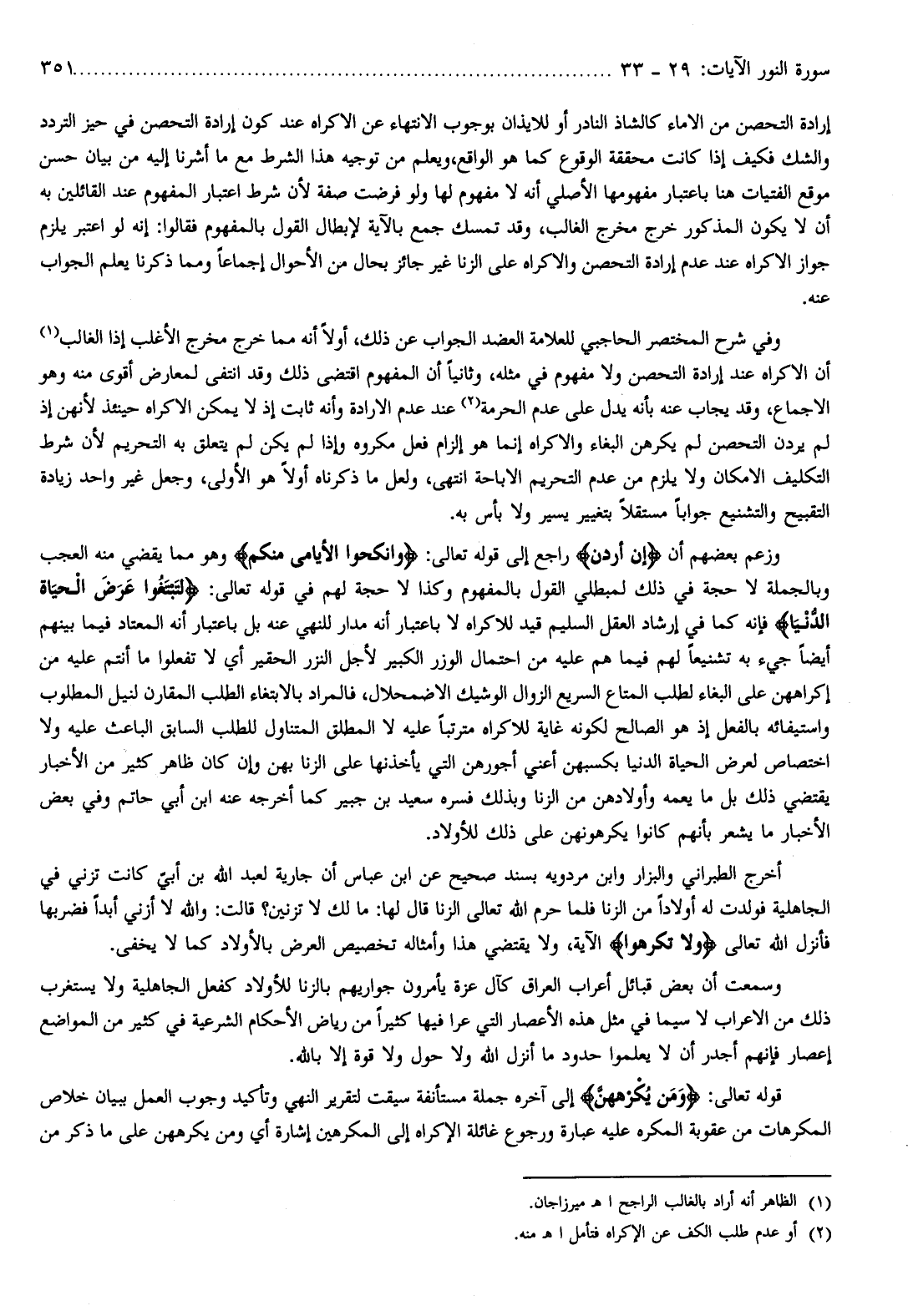 وفي شرح المختصر الحاجبي للعلامة العضد الجواب عن ذلك، أولا أنه مما خرج مخرج الأغلب إذا الغالب (¬1) أن الإكراه عند إرادة التحصن ولا مفهوم في مثله، وثانيا أن المفهوم اقتضى ذلك وقد انتفى لمعارض أقوى منه وهو الإجماع، وقد يجاب عنه بأنه يدل على عدم الحرمة (¬2) عند عدم الارادة وأنه ثابت إذ لا يمكن الإكراه حينئذ لأنهن إذ لم يردن التحصن لم يكرهن البغاء والإكراه إنما هو إلزام فعل مكروه وإذا لم يكن لم يتعلق به التحريم لأن شرط التكليف الإمكان ولا يلزم من عدم التحريم الإباحة انتهى، ولعل ما ذكرناه أولا هو الأولى، وجعل غير واحد زيادة التقبيح والتشنيع جوابا مستقلا بتغيير يسير ولا بأس به.