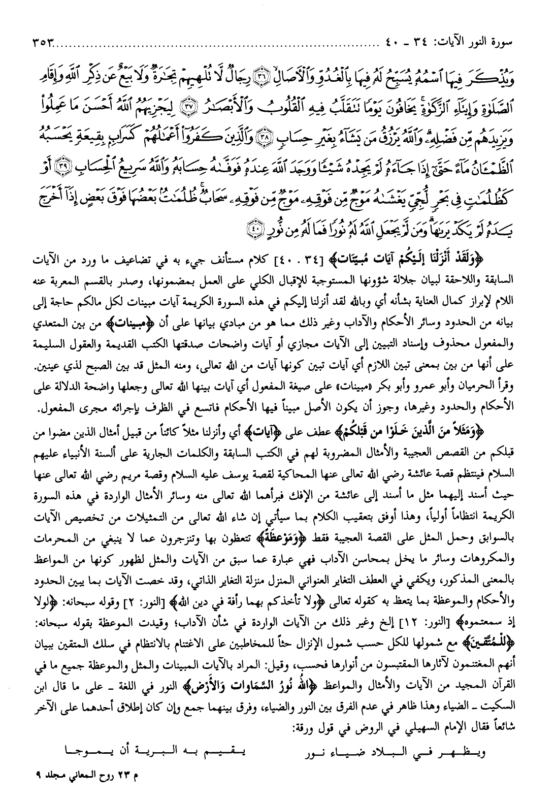 وَلَقَدْ أَنْزَلْنا إِلَيْكُمْ آياتٍ مُبَيِّناتٍ [34. 40] كلام مستأنف جيء به في تضاعيف ما ورد من الآيات السابقة واللاحقة لبيان جلالة شؤونها المستوجبة للإقبال الكلي على العمل بمضمونها، وصدر بالقسم المعربة عنه اللام لإبراز كمال العناية بشأنه أي وبالله لقد أنزلنا إليكم في هذه السورة الكريمة آيات مبينات لكل مالكم حاجة إلى بيانه من الحدود وسائر الأحكام والآداب وغير ذلك مما هو من مبادي بيانها على أن مُبَيِّناتٍ من بين المتعدي والمفعول محذوف وإسناد التبيين إلى الآيات مجازي أو آيات واضحات صدقتها الكتب القديمة والعقول السليمة على أنها من بين بمعنى تبين اللازم أي آيات تبين كونها آيات من الله تعالى، ومنه المثل قد بين الصبح لذي عينين.