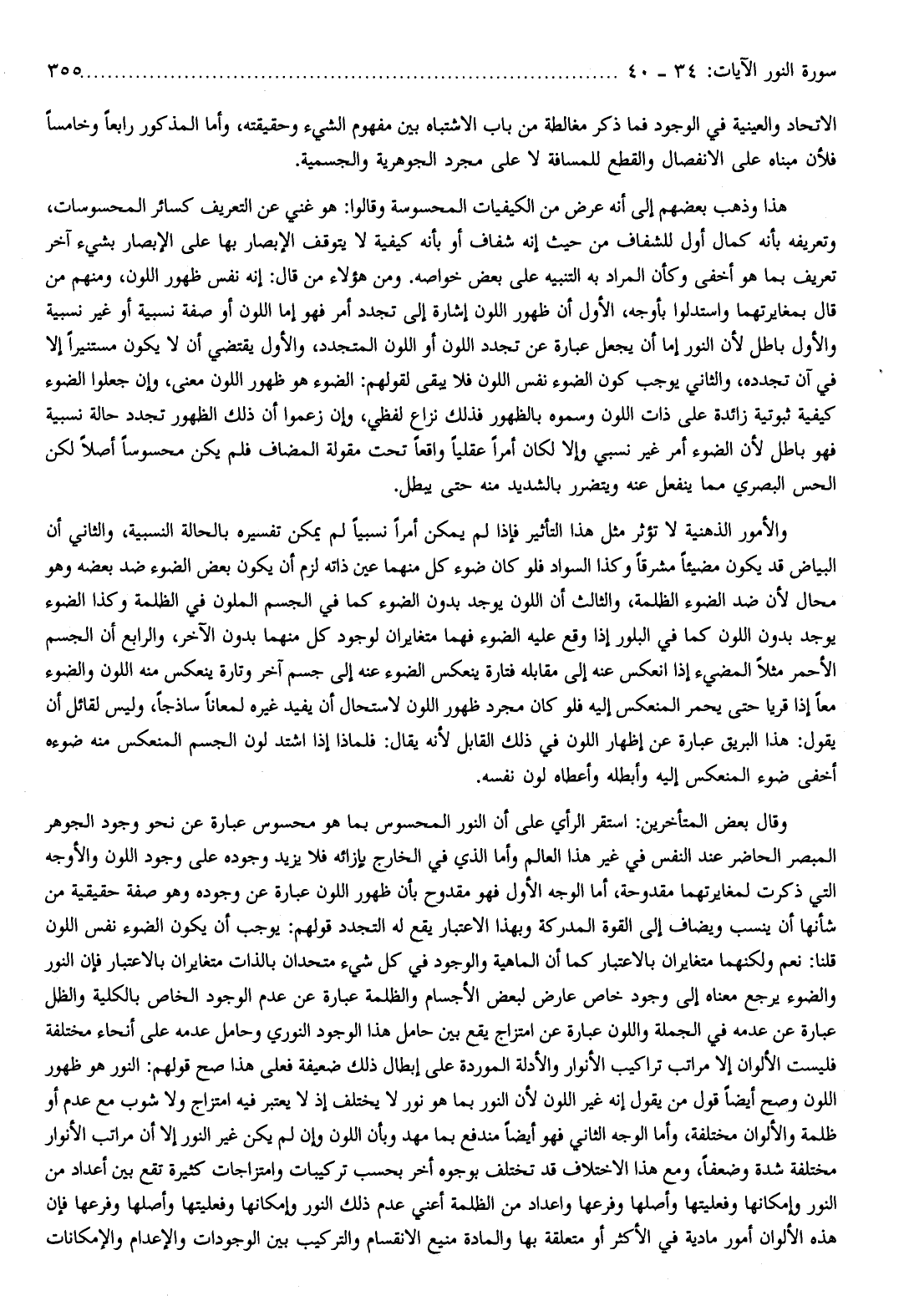 وقال بعض المتأخرين: استقر الرأي على أن النور المحسوس بما هو محسوس عبارة عن نحو وجود الجوهر المبصر الحاضر عند النفس في غير هذا العالم وأما الذي في الخارج بإزائه فلا يزيد وجوده على وجود اللون والأوجه التي ذكرت لمغايرتهما مقدوحة، أما الوجه الأول فهو مقدوح بأن ظهور اللون عبارة عن وجوده وهو صفة حقيقية من شأنها أن ينسب ويضاف إلى القوة المدركة وبهذا الاعتبار يقع له التجدد قولهم: يوجب أن يكون الضوء نفس اللون قلنا: نعم ولكنهما متغايران بالاعتبار كما أن الماهية والوجود في كل شيء متحدان بالذات متغايران بالاعتبار فإن النور والضوء يرجع معناه إلى وجود خاص عارض لبعض الأجسام والظلمة عبارة عن عدم الوجود الخاص بالكلية والظل عبارة عن عدمه في الجملة واللون عبارة عن امتزاج يقع بين حامل هذا الوجود النوري وحامل عدمه على أنحاء مختلفة فليست الألوان إلا مراتب تراكيب الأنوار والأدلة الموردة على إبطال ذلك ضعيفة فعلى هذا صح قولهم: النور هو ظهور اللون وصح أيضا قول من يقول إنه غير اللون لأن النور بما هو نور لا يختلف إذ لا يعتبر فيه امتزاج ولا شوب مع عدم أو ظلمة والألوان مختلفة، وأما الوجه الثاني فهو أيضا مندفع بما مهد وبأن اللون وإن لم يكن غير النور إلا أن مراتب الأنوار مختلفة شدة وضعفا، ومع هذا الاختلاف قد تختلف بوجوه أخر بحسب تركيبات وامتزاجات كثيرة تقع بين أعداد من النور وإمكانها وفعليتها وأصلها وفرعها واعداد من الظلمة أعني عدم ذلك النور وإمكانها وفعليتها وأصلها وفرعها فإن هذه الألوان أمور مادية في الأكثر أو متعلقة بها والمادة منيع الانقسام والتركيب بين الوجودات والإعدام والإمكانات