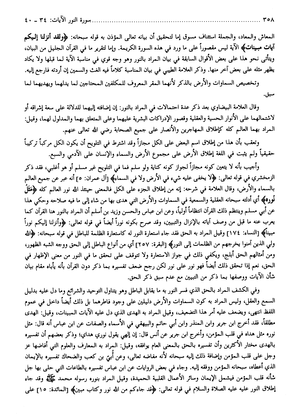 وقال العلامة البيضاوي بعد ذكر عدة احتمالات في المراد بالنور: إن إضافته إليهما للدلالة على سعة إشراقه أو لاشتمالهما على الأنوار الحسية والعقلية وقصور الإدراكات البشرية عليهما وعلى المتعلق بهما والمدلول لهما، وقيل: