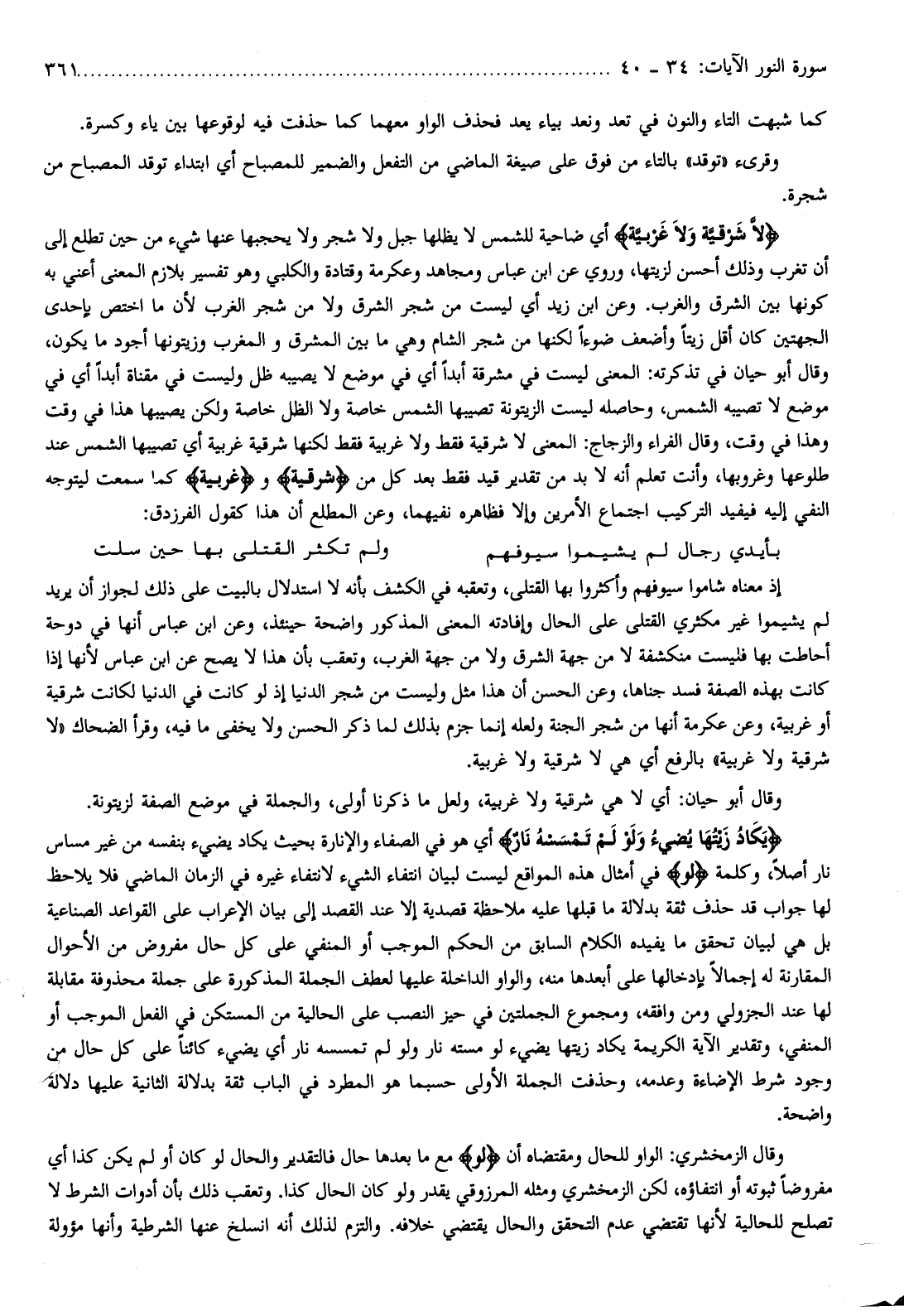 لا شَرْقِيَّةٍ وَلا غَرْبِيَّةٍ أي ضاحية للشمس لا يظلها جبل ولا شجر ولا يحجبها عنها شيء من حين تطلع إلى أن تغرب وذلك أحسن لزيتها، وروي عن ابن عباس ومجاهد وعكرمة وقتادة والكلبي وهو تفسير بلازم المعنى أعني به كونها بين الشرق والغرب. وعن ابن زيد أي ليست من شجر الشرق ولا من شجر الغرب لأن ما اختص بإحدى الجهتين كان أقل زيتا وأضعف ضوءا لكنها من شجر الشام وهي ما بين المشرق والمغرب وزيتونها أجود ما يكون، وقال أبو حيان في تذكرته: المعنى ليست في مشرقة أبدا أي في موضع لا يصيبه ظل وليست في مقناة أبدا أي في موضع لا تصيبه الشمس، وحاصله ليست الزيتونة تصيبها الشمس خاصة ولا الظل خاصة ولكن يصيبها هذا في وقت وهذا في وقت، وقال الفراء والزجاج: المعنى لا شرقية فقط ولا غربية فقط لكنها شرقية غربية أي تصيبها الشمس عند طلوعها وغروبها، وأنت تعلم أنه لا بد من تقدير قيد فقط بعد كل من شَرْقِيَّةٍ وغَرْبِيَّةٍ كما سمعت ليتوجه النفي إليه فيفيد التركيب اجتماع الأمرين وإلا فظاهره نفيهما، وعن المطلع أن هذا كقول الفرزدق: