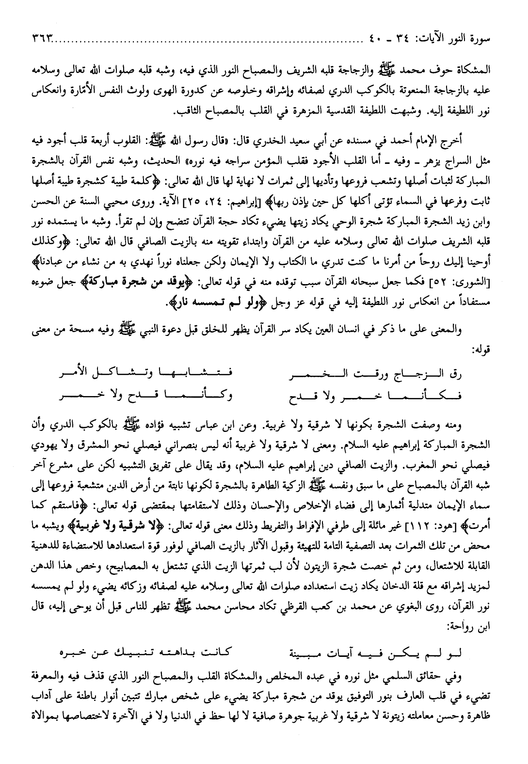 وشبه نفس القرآن بالشجرة المباركة لثبات أصلها وتشعب فروعها وتأديها إلى ثمرات لا نهاية لها قال الله تعالى: كَلِمَةً طَيِّبَةً كَشَجَرَةٍ طَيِّبَةٍ أَصْلُها ثابِتٌ وَفَرْعُها فِي السَّماءِ تُؤْتِي أُكُلَها كُلَّ حِينٍ بِإِذْنِ رَبِّها [إبراهيم: 24، 25] الآية. وروى محيي السنة عن الحسن وابن زيد الشجرة المباركة شجرة الوحي يكاد زيتها يضيء تكاد حجة القرآن تتضح وإن لم تقرأ. وشبه ما يستمده نور قلبه الشريف صلوات الله تعالى وسلامه عليه من القرآن وابتداء تقويته منه بالزيت الصافي قال الله تعالى: وَكَذلِكَ أَوْحَيْنا إِلَيْكَ رُوحاً مِنْ أَمْرِنا ما كُنْتَ تَدْرِي مَا الْكِتابُ وَلَا الْإِيمانُ وَلكِنْ جَعَلْناهُ نُوراً نَهْدِي بِهِ مَنْ نَشاءُ مِنْ عِبادِنا [الشورى: 52] فكما جعل سبحانه القرآن سبب توقده منه في قوله تعالى: يُوقَدُ مِنْ شَجَرَةٍ مُبارَكَةٍ جعل ضوءه مستفادا من انعكاس نور اللطيفة إليه في قوله عز وجل وَلَوْ لَمْ تَمْسَسْهُ نارٌ.