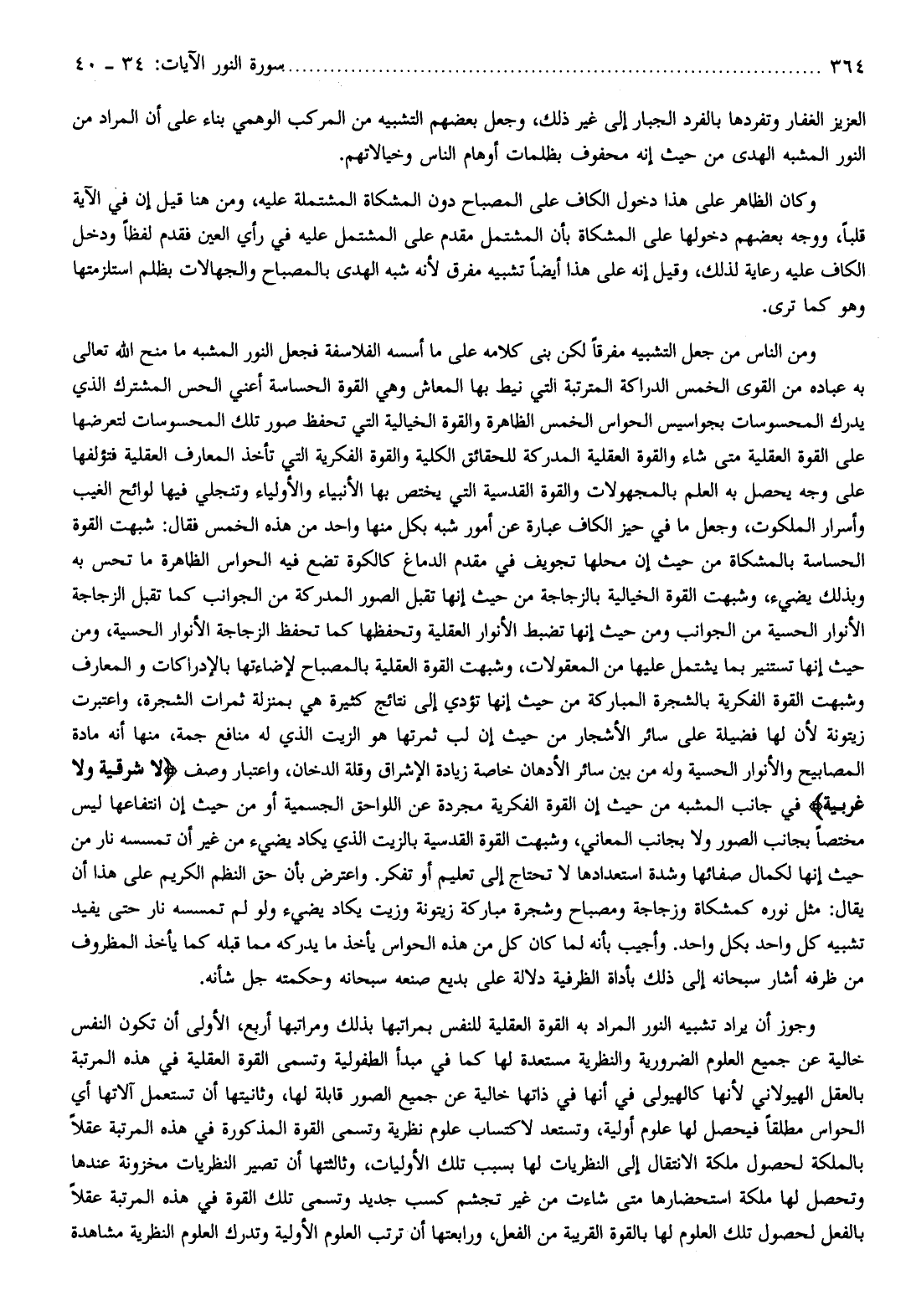 ومن الناس من جعل التشبيه مفرقا لكن بنى كلامه على ما أسسه الفلاسفة فجعل النور المشبه ما منح الله تعالى به عباده من القوى الخمس الدراكة المترتبة التي نيط بها المعاش وهي القوة الحساسة أعني الحس المشترك الذي يدرك المحسوسات بجواسيس الحواس الخمس الظاهرة والقوة الخيالية التي تحفظ صور تلك المحسوسات لتعرضها على القوة العقلية متى شاء والقوة العقلية المدركة للحقائق الكلية والقوة الفكرية التي تأخذ المعارف العقلية فتؤلفها على وجه يحصل به العلم بالمجهولات والقوة القدسية التي يختص بها الأنبياء والأولياء وتنجلي فيها لوائح الغيب وأسرار الملكوت، وجعل ما في حيز الكاف عبارة عن أمور شبه بكل منها واحد من هذه الخمس فقال: شبهت القوة الحساسة بالمشكاة من حيث إن محلها تجويف في مقدم الدماغ كالكوة تضع فيه الحواس الظاهرة ما تحس به وبذلك يضيء، وشبهت القوة الخيالية بالزجاجة من حيث إنها تقبل الصور المدركة من الجوانب كما تقبل الزجاجة الأنوار الحسية من الجوانب ومن حيث إنها تضبط الأنوار العقلية وتحفظها كما تحفظ الزجاجة الأنوار الحسية، ومن حيث إنها تستنير بما يشتمل عليها من المعقولات، وشبهت القوة العقلية بالمصباح لإضاءتها بالإدراكات والمعارف وشبهت القوة الفكرية بالشجرة المباركة من حيث إنها تؤدي إلى نتائج كثيرة هي بمنزلة ثمرات الشجرة، واعتبرت زيتونة لأن لها فضيلة على سائر الأشجار من حيث إن لب ثمرتها هو الزيت الذي له منافع جمة، منها أنه مادة المصابيح والأنوار الحسية وله من بين سائر الأدهان خاصة زيادة الإشراق وقلة الدخان، واعتبار وصف لا شَرْقِيَّةٍ وَلا غَرْبِيَّةٍ في جانب المشبه من حيث إن القوة الفكرية مجردة عن اللواحق الجسمية أو من حيث إن انتفاعها ليس مختصا بجانب الصور ولا بجانب المعاني، وشبهت القوة القدسية بالزيت الذي يكاد يضيء من غير أن تمسسه نار من حيث إنها لكمال صفائها وشدة استعدادها لا تحتاج إلى تعليم أو تفكر. واعترض بأن حق النظم الكريم على هذا أن يقال: مثل نوره كمشكاة وزجاجة ومصباح وشجرة مباركة زيتونة وزيت يكاد يضيء ولو لم تمسسه نار حتى يفيد تشبيه كل واحد بكل واحد. وأجيب بأنه لما كان كل من هذه الحواس يأخذ ما يدركه مما قبله كما يأخذ المظروف من ظرفه أشار سبحانه إلى ذلك بأداة الظرفية دلالة على بديع صنعه سبحانه وحكمته جل شأنه.