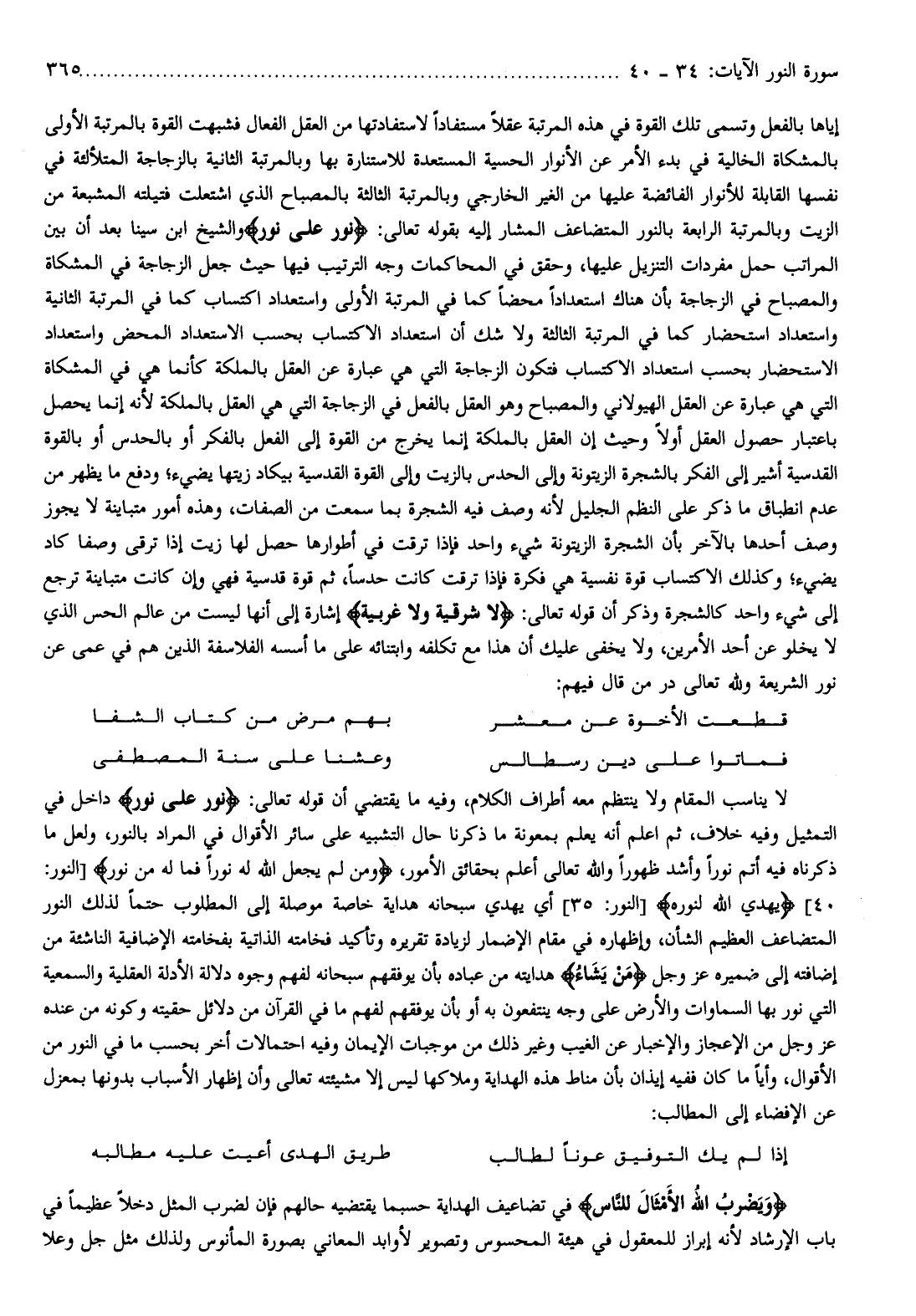 إياها بالفعل وتسمى تلك القوة في هذه المرتبة عقلا مستفادا لاستفادتها من العقل الفعال فشبهت القوة بالمرتبة الأولى بالمشكاة الخالية في بدء الأمر عن الأنوار الحسية المستعدة للاستنارة بها وبالمرتبة الثانية بالزجاجة المتلألئة في نفسها القابلة للأنوار الفائضة عليها من الغير الخارجي وبالمرتبة الثالثة بالمصباح الذي اشتعلت فتيلته المشبعة من الزيت وبالمرتبة الرابعة بالنور المتضاعف المشار إليه بقوله تعالى: نُورٌ عَلى نُورٍ والشيخ ابن سينا بعد أن بين المراتب حمل مفردات التنزيل عليها، وحقق في المحاكمات وجه الترتيب فيها حيث جعل الزجاجة في المشكاة والمصباح في الزجاجة بأن هناك استعدادا محضا كما في المرتبة الأولى واستعداد اكتساب كما في المرتبة الثانية واستعداد استحضار كما في المرتبة الثالثة ولا شك أن استعداد الاكتساب بحسب الاستعداد المحض واستعداد الاستحضار بحسب استعداد الاكتساب فتكون الزجاجة التي هي عبارة عن العقل بالملكة كأنما هي في المشكاة التي هي عبارة عن العقل الهيولاني والمصباح وهو العقل بالفعل في الزجاجة التي هي العقل بالملكة لأنه إنما يحصل باعتبار حصول العقل أولا وحيث إن العقل بالملكة إنما يخرج من القوة إلى الفعل بالفكر أو بالحدس أو بالقوة القدسية أشير إلى الفكر بالشجرة الزيتونة وإلى الحدس بالزيت وإلى القوة القدسية بيكاد زيتها يضيء ودفع ما يظهر من عدم انطباق ما ذكر على النظم الجليل لأنه وصف فيه الشجرة بما سمعت من الصفات، وهذه أمور متباينة لا يجوز وصف أحدها بالآخر بأن الشجرة الزيتونة شيء واحد فإذا ترقت في أطوارها حصل لها زيت إذا ترقى وصفا كاد يضيء وكذلك الاكتساب قوة نفسية هي فكرة فإذا ترقت كانت حدسا، ثم قوة قدسية فهي وإن كانت متباينة ترجع إلى شيء واحد كالشجرة وذكر أن قوله تعالى: لا شَرْقِيَّةٍ وَلا غَرْبِيَّةٍ إشارة إلى أنها ليست من عالم الحس الذي لا يخلو عن أحد الأمرين، ولا يخفى عليك أن هذا مع تكلفه وابتنائه على ما أسسه الفلاسفة الذين هم في عمى عن نور الشريعة ولله تعالى در من قال فيهم: