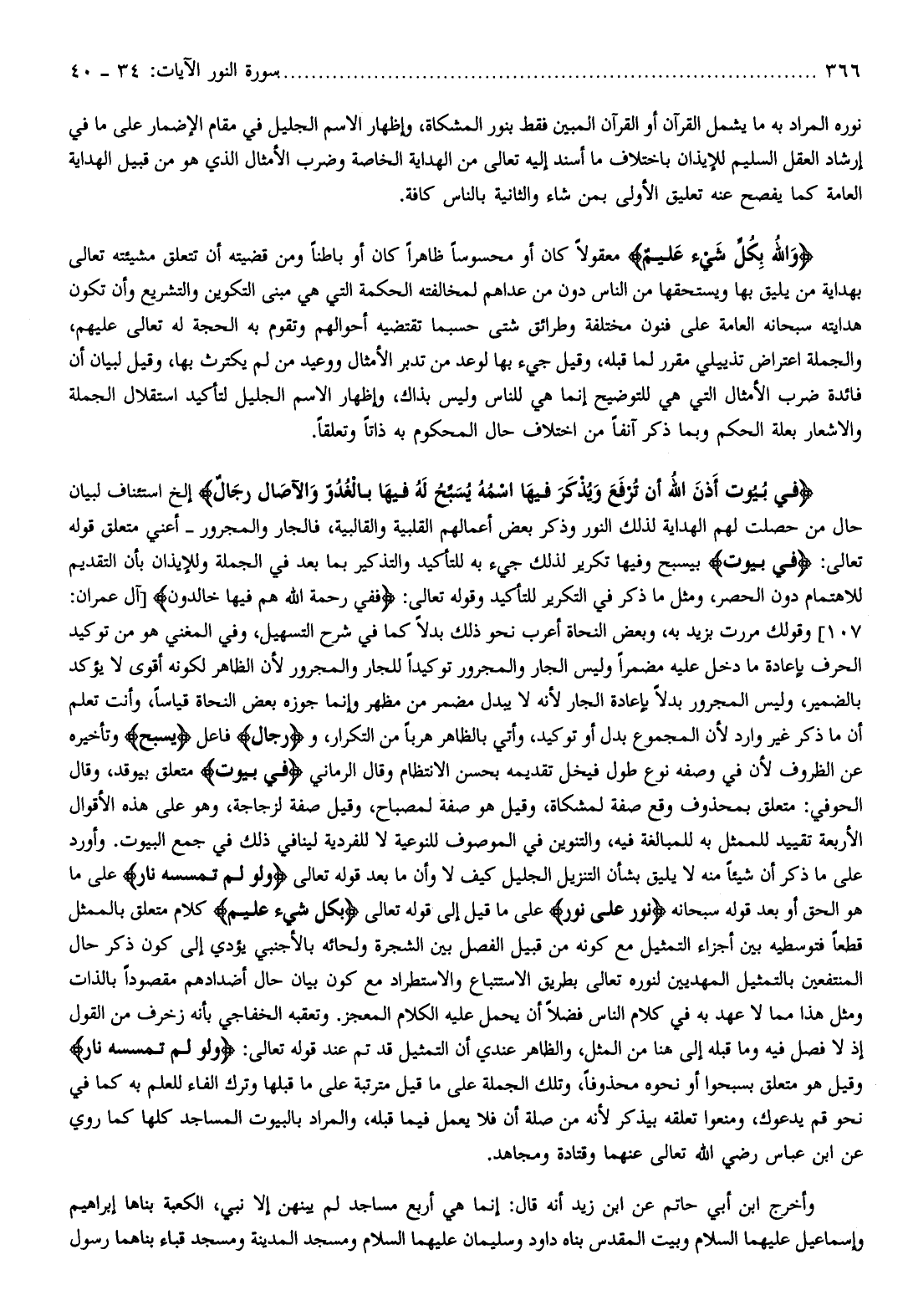 107] وقولك مررت بزيد به، وبعض النحاة أعرب نحو ذلك بدلا كما في شرح التسهيل، وفي المغني هو من توكيد الحرف بإعادة ما دخل عليه مضمرا وليس الجار والمجرور توكيدا للجار والمجرور لأن الظاهر لكونه أقوى لا يؤكد بالضمير، وليس المجرور بدلا بإعادة الجار لأنه لا يبدل مضمر من مظهر وإنما جوزه بعض النحاة قياسا، وأنت تعلم أن ما ذكر غير وارد لأن المجموع بدل أو توكيد، وأتي بالظاهر هربا من التكرار، ورِجالٌ فاعل يُسَبِّحُ وتأخيره عن الظروف لأن في وصفه نوع طول فيخل تقديمه بحسن الانتظام وقال الرماني فِي بُيُوتٍ متعلق بيوقد، وقال الحوفي: متعلق بمحذوف وقع صفة لمشكاة، وقيل هو صفة لمصباح، وقيل صفة لزجاجة، وهو على هذه الأقوال الأربعة تقييد للممثل به للمبالغة فيه، والتنوين في الموصوف للنوعية لا للفردية لينافي ذلك في جمع البيوت. وأورد على ما ذكر أن شيئا منه لا يليق بشأن التنزيل الجليل كيف لا وأن ما بعد قوله تعالى وَلَوْ لَمْ تَمْسَسْهُ نارٌ على ما هو الحق أو بعد قوله سبحانه نُورٌ عَلى نُورٍ على ما قيل إلى قوله تعالى بِكُلِّ شَيْءٍ عَلِيمٌ كلام متعلق بالممثل قطعا فتوسطيه بين أجزاء التمثيل مع كونه من قبيل الفصل بين الشجرة ولحائه بالأجنبي يؤدي إلى كون ذكر حال المنتفعين بالتمثيل المهديين لنوره تعالى بطريق الاستتباع والاستطراد مع كون بيان حال أضدادهم مقصودا بالذات ومثل هذا مما لا عهد به في كلام الناس فضلا أن يحمل عليه الكلام المعجز. وتعقبه الخفاجي بأنه زخرف من القول إذ لا فصل فيه وما قبله إلى هنا من المثل، والظاهر عندي أن التمثيل قد تم عند قوله تعالى: وَلَوْ لَمْ تَمْسَسْهُ نارٌ وقيل هو متعلق بسبحوا أو نحوه محذوفا، وتلك الجملة على ما قيل مترتبة على ما قبلها وترك الفاء للعلم به كما في نحو قم يدعوك، ومنعوا تعلقه بيذكر لأنه من صلة أن فلا يعمل فيما قبله، والمراد بالبيوت المساجد كلها كما روي عن ابن عباس رضي الله تعالى عنهما وقتادة ومجاهد.