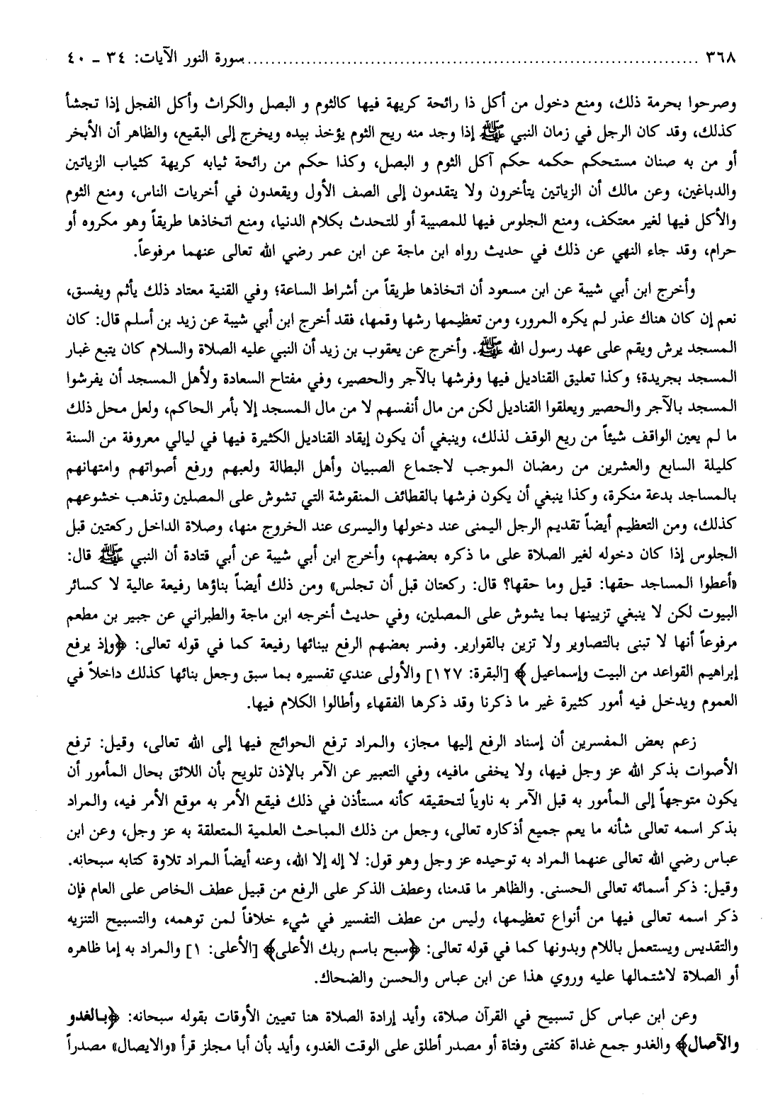 ومن ذلك أيضا بناؤها رفيعة عالية لا كسائر البيوت لكن لا ينبغي تزيينها بما يشوش على المصلين، وفي حديث أخرجه ابن ماجة والطبراني عن جبير بن مطعم مرفوعا أنها لا تبنى بالتصاوير ولا تزين بالقوارير. وفسر بعضهم الرفع ببنائها رفيعة كما في قوله تعالى: وَإِذْ يَرْفَعُ إِبْراهِيمُ الْقَواعِدَ مِنَ الْبَيْتِ وَإِسْماعِيلُ [البقرة: 127] والأولى عندي تفسيره بما سبق وجعل بنائها كذلك داخلا في العموم ويدخل فيه أمور كثيرة غير ما ذكرنا وقد ذكرها الفقهاء وأطالوا الكلام فيها.