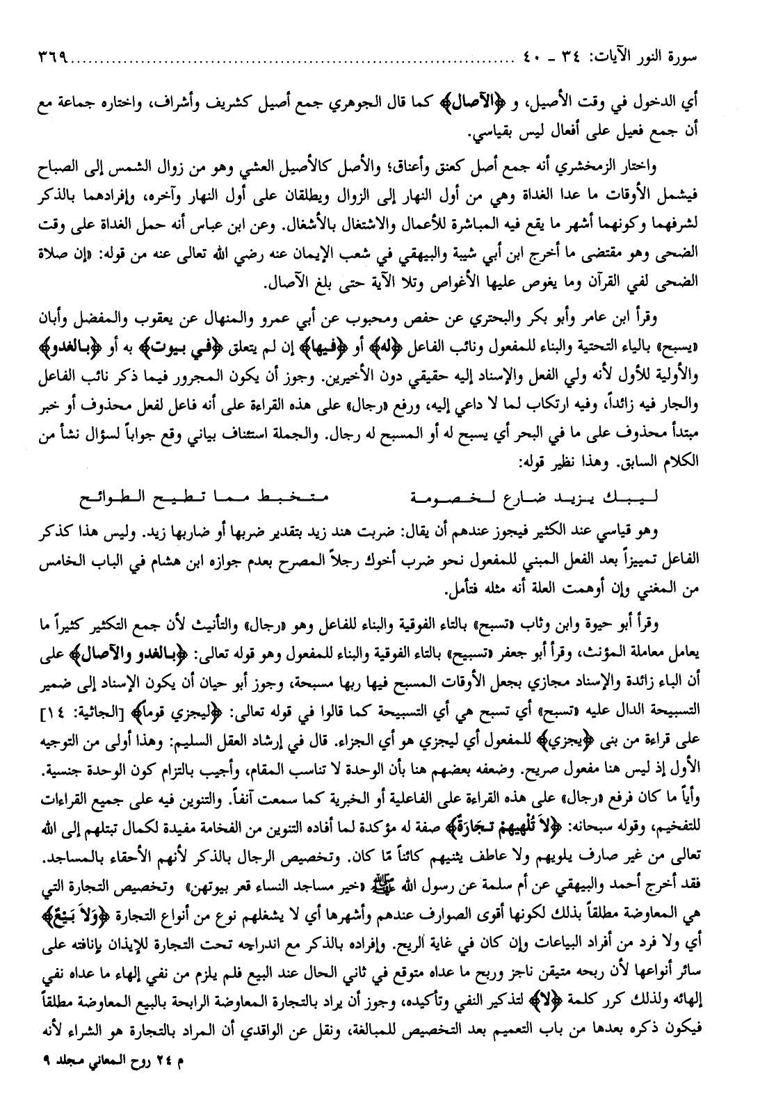 وقرأ ابن عامر وأبو بكر والبحتري عن حفص ومحبوب عن أبي عمرو والمنهال عن يعقوب والمفضل وأبان «يسبح» بالياء التحتية والبناء للمفعول ونائب الفاعل لَهُ أو فِيهَا إن لم يتعلق فِي بُيُوتٍ به أو بِالْغُدُوِّ والأولية للأول لأنه ولي الفعل والإسناد إليه حقيقي دون الأخيرين. وجوز أن يكون المجرور فيما ذكر نائب الفاعل والجار فيه زائدا، وفيه ارتكاب لما لا داعي إليه، ورفع «رجال» على هذه القراءة على أنه فاعل لفعل محذوف أو خبر مبتدأ محذوف على ما في البحر أي يسبح له أو المسبح له رجال. والجملة استئناف بياني وقع جوابا لسؤال نشأ من الكلام السابق. وهذا نظير قوله: