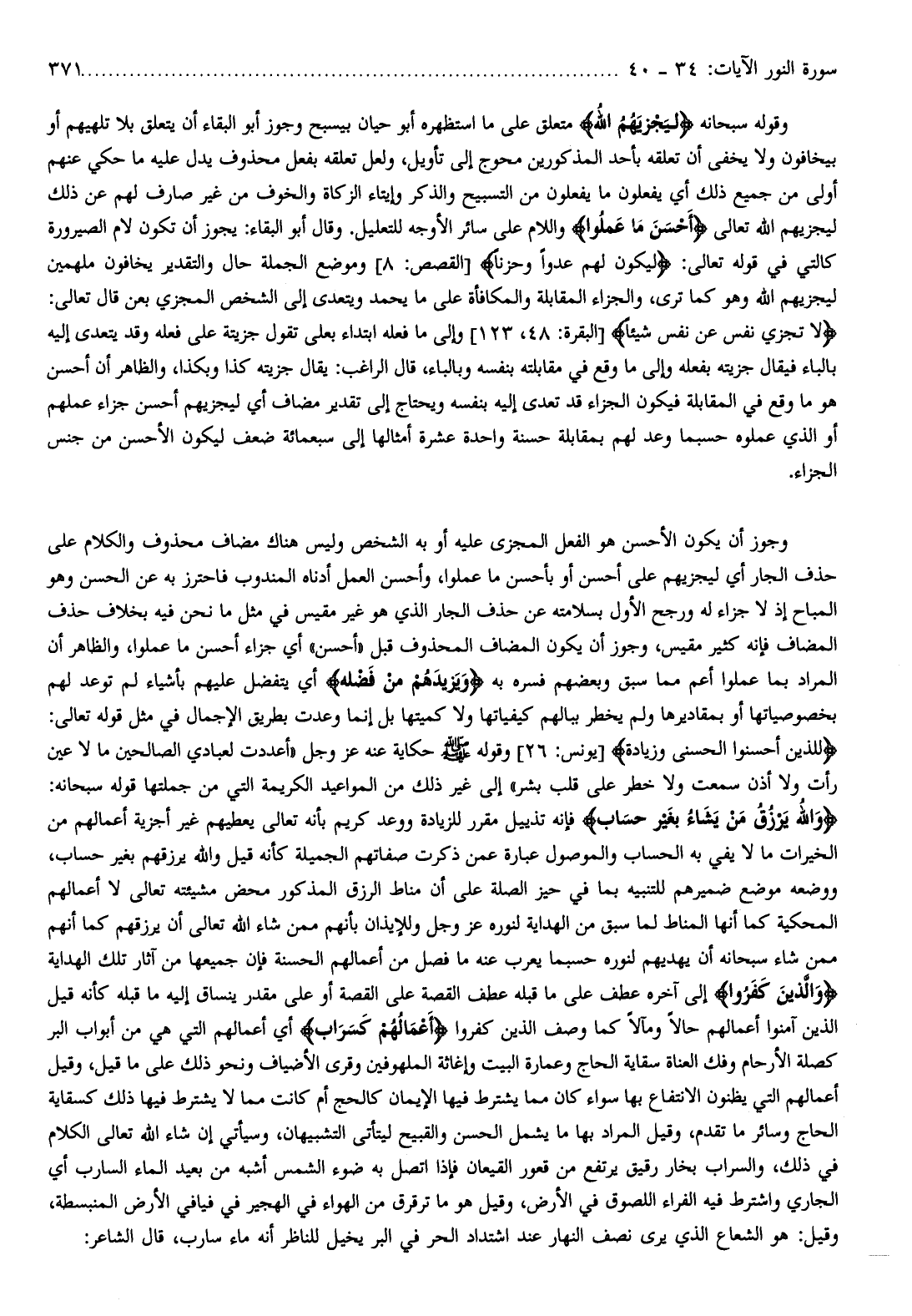 وَاللَّهُ يَرْزُقُ مَنْ يَشاءُ بِغَيْرِ حِسابٍ فإنه تذييل مقرر للزيادة ووعد كريم بأنه تعالى يعطيهم غير أجزية أعمالهم من الخيرات ما لا يفي به الحساب والموصول عبارة عمن ذكرت صفاتهم الجميلة كأنه قيل والله يرزقهم بغير حساب، ووضعه موضع ضميرهم للتنبيه بما في حيز الصلة على أن مناط الرزق المذكور محض مشيئته تعالى لا أعمالهم المحكية كما أنها المناط لما سبق من الهداية لنوره عز وجل وللإيذان بأنهم ممن شاء الله تعالى أن يرزقهم كما أنهم ممن شاء سبحانه أن يهديهم لنوره حسبما يعرب عنه ما فصل من أعمالهم الحسنة فإن جميعها من آثار تلك الهداية وَالَّذِينَ كَفَرُوا إلى آخره عطف على ما قبله عطف القصة على القصة أو على مقدر ينساق إليه ما قبله كأنه قيل الذين آمنوا أعمالهم حالا ومآلا كما وصف الذين كفروا أَعْمالُهُمْ كَسَرابٍ أي أعمالهم التي هي من أبواب البر كصلة الأرحام وفك العناة سقاية الحاج وعمارة البيت وإغاثة الملهوفين وقرى الأضياف ونحو ذلك على ما قيل، وقيل أعمالهم التي يظنون الانتفاع بها سواء كان مما يشترط فيها الإيمان كالحج أم كانت مما لا يشترط فيها ذلك كسقاية الحاج وسائر ما تقدم، وقيل المراد بها ما يشمل الحسن والقبيح ليتأتى التشبيهان، وسيأتي إن شاء الله تعالى الكلام في ذلك، والسراب بخار رقيق يرتفع من قعور القيعان فإذا اتصل به ضوء الشمس أشبه من بعيد الماء السارب أي الجاري واشترط فيه الفراء اللصوق في الأرض، وقيل هو ما ترقرق من الهواء في الهجير في فيافي الأرض المنبسطة، وقيل: هو الشعاع الذي يرى نصف النهار عند اشتداد الحر في البر يخيل للناظر أنه ماء سارب، قال الشاعر: