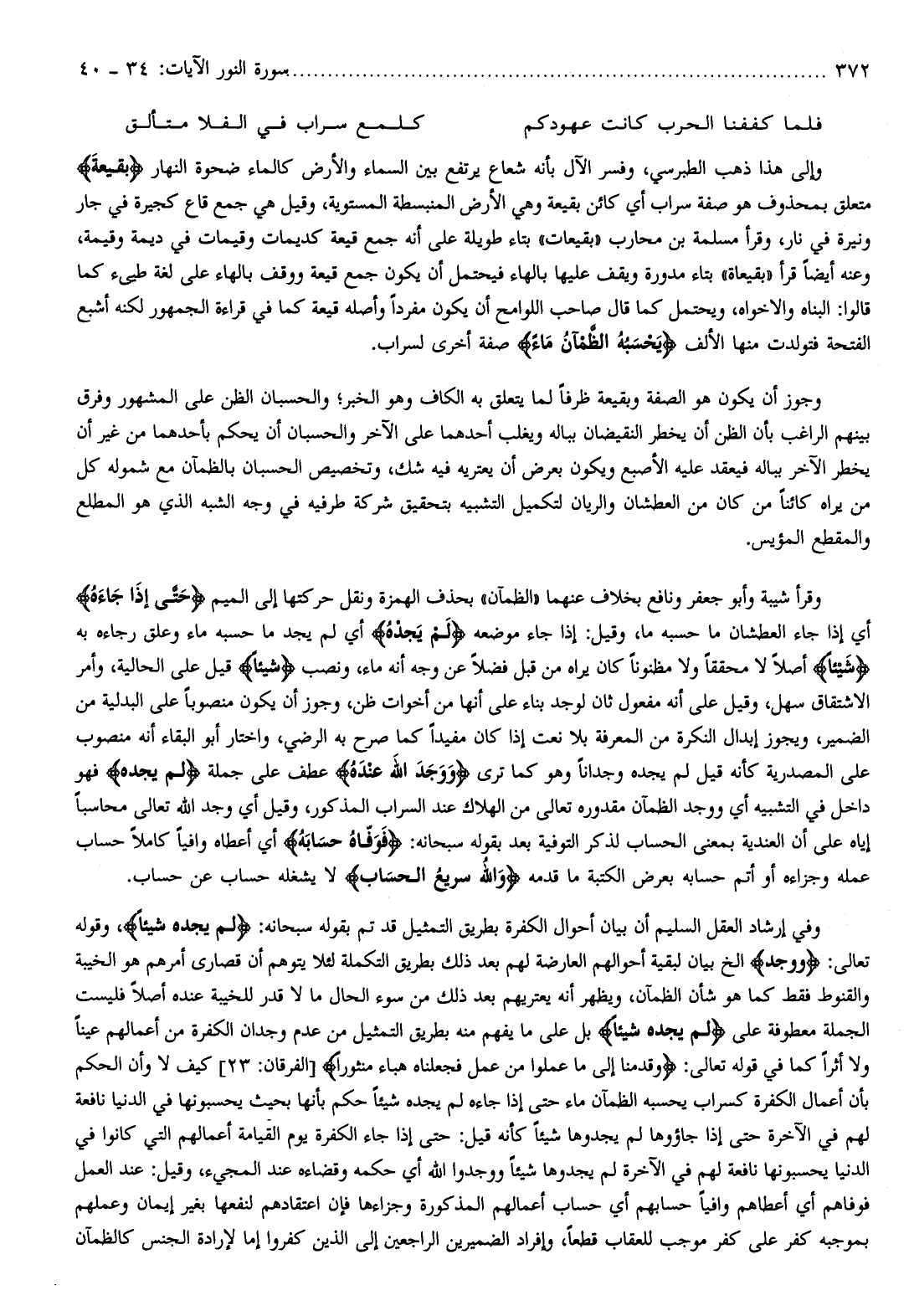 وإلى هذا ذهب الطبرسي، وفسر الآل بأنه شعاع يرتفع بين السماء والأرض كالماء ضحوة النهار بِقِيعَةٍ متعلق بمحذوف هو صفة سراب أي كائن بقيعة وهي الأرض المنبسطة المستوية، وقيل هي جمع قاع كجيرة في جار ونيرة في نار، وقرأ مسلمة بن محارب «بقيعات» بتاء طويلة على أنه جمع قيعة كديمات وقيمات في ديمة وقيمة، وعنه أيضا قرأ «بقيعاة» بتاء مدورة ويقف عليها بالهاء فيحتمل أن يكون جمع قيعة ووقف بالهاء على لغة طيىء كما قالوا: البناه والاخواه، ويحتمل كما قال صاحب اللوامح أن يكون مفردا وأصله قيعة كما في قراءة الجمهور لكنه أشبع الفتحة فتولدت منها الألف يَحْسَبُهُ الظَّمْآنُ ماءً صفة أخرى لسراب.