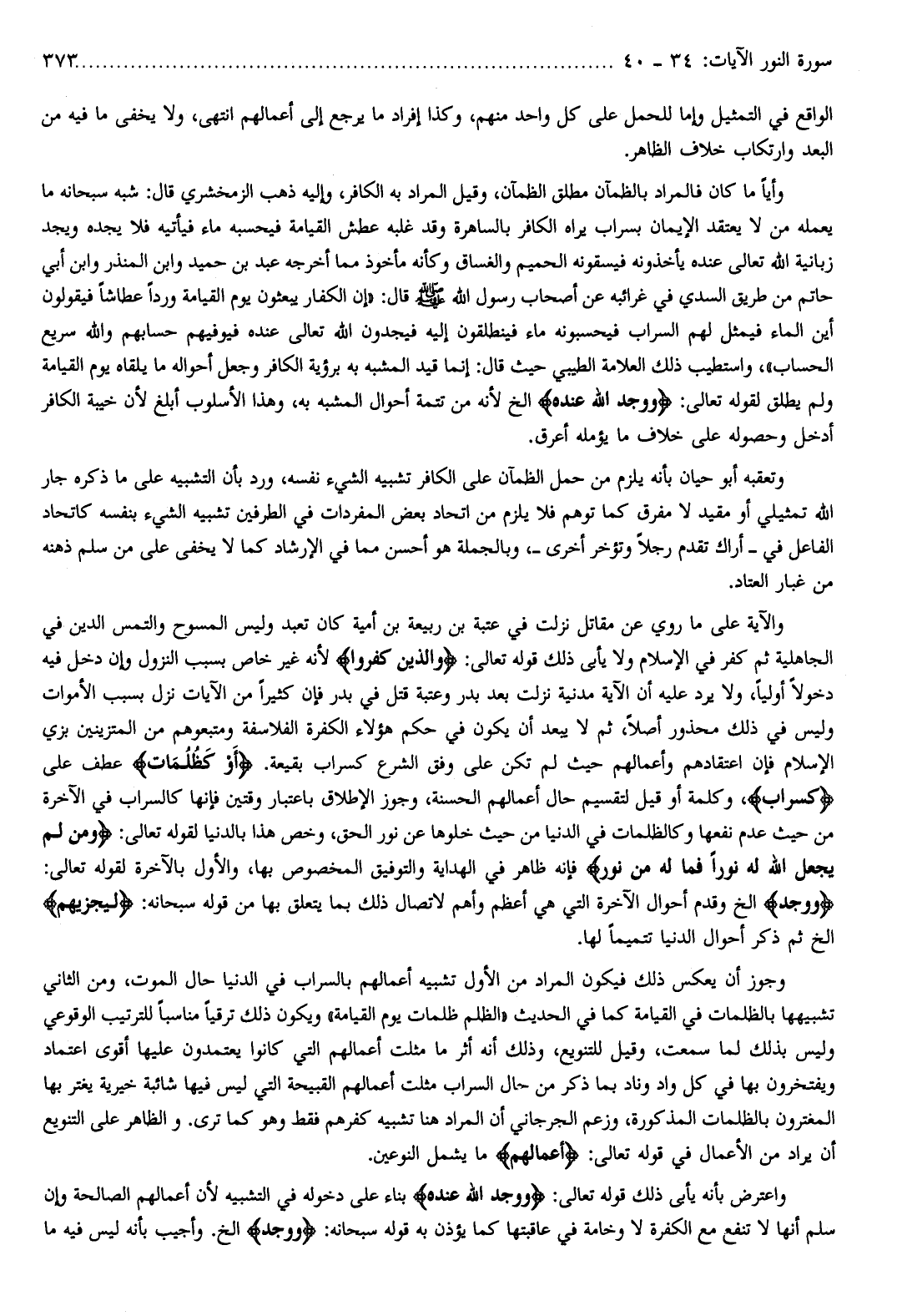 ويكون ذلك ترقيا مناسبا للترتيب الوقوعي وليس بذلك لما سمعت، وقيل للتنويع، وذلك أنه أثر ما مثلت أعمالهم التي كانوا يعتمدون عليها أقوى اعتماد ويفتخرون بها في كل واد وناد بما ذكر من حال السراب مثلت أعمالهم القبيحة التي ليس فيها شائبة خيرية يغتر بها المغترون بالظلمات المذكورة، وزعم الجرجاني أن المراد هنا تشبيه كفرهم فقط وهو كما ترى. والظاهر على التنويع أن يراد من الأعمال في قوله تعالى: أَعْمالُهُمْ ما يشمل النوعين.