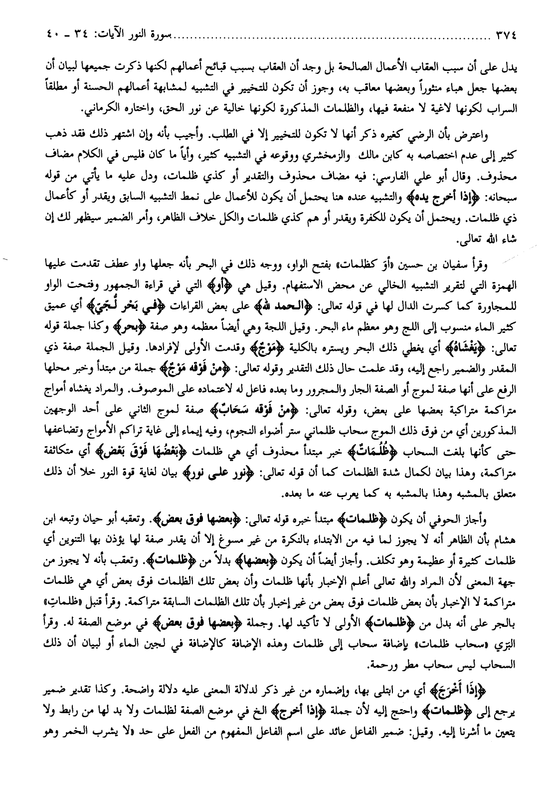 واعترض بأن الرضي كغيره ذكر أنها لا تكون للتخيير إلا في الطلب. وأجيب بأنه وإن اشتهر ذلك فقد ذهب كثير إلى عدم اختصاصه به كابن مالك والزمخشري ووقوعه في التشبيه كثير، وأيا ما كان فليس في الكلام مضاف محذوف. وقال أبو علي الفارسي: فيه مضاف محذوف والتقدير أو كذي ظلمات، ودل عليه ما يأتي من قوله سبحانه: إِذا أَخْرَجَ يَدَهُ والتشبيه عنده هنا يحتمل أن يكون للأعمال على نمط التشبيه السابق ويقدر أو كأعمال ذي ظلمات. ويحتمل أن يكون للكفرة ويقدر أو هم كذي ظلمات والكل خلاف الظاهر، وأمر الضمير سيظهر لك إن شاء الله تعالى.