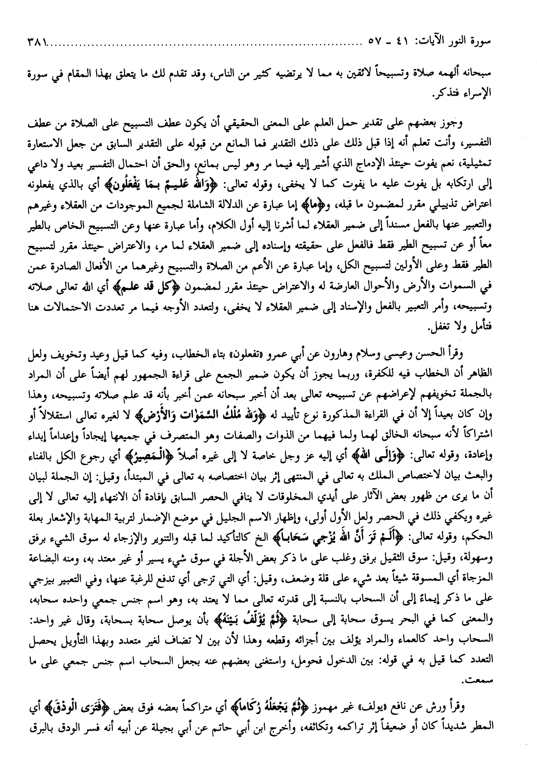 وجوز بعضهم على تقدير حمل العلم على المعنى الحقيقي أن يكون عطف التسبيح على الصلاة من عطف التفسير، وأنت تعلم أنه إذا قبل ذلك على ذلك التقدير فما المانع من قبوله على التقدير السابق من جعل الاستعارة تمثيلية، نعم يفوت حينئذ الإدماج الذي أشير إليه فيما مر وهو ليس بمانع، والحق أن احتمال التفسير بعيد ولا داعي إلى ارتكابه بل يفوت عليه ما يفوت كما لا يخفى، وقوله تعالى: وَاللَّهُ عَلِيمٌ بِما يَفْعَلُونَ أي بالذي يفعلونه اعتراض تذييلي مقرر لمضمون ما قبله، و (ما) إما عبارة عن الدلالة الشاملة لجميع الموجودات من العقلاء وغيرهم والتعبير عنها بالفعل مسندا إلى ضمير العقلاء لما أشرنا إليه أول الكلام، وأما عبارة عنها وعن التسبيح الخاص بالطير معا أو عن تسبيح الطير فقط فالفعل على حقيقته وإسناده إلى ضمير العقلاء لما مر، والاعتراض حينئذ مقرر لتسبيح الطير فقط وعلى الأولين لتسبيح الكل، وإما عبارة عن الأعم من الصلاة والتسبيح وغيرهما من الأفعال الصادرة عمن في السموات والأرض والأحوال العارضة له والاعتراض حينئذ مقرر لمضمون كُلٌّ قَدْ عَلِمَ أي الله تعالى صلاته وتسبيحه، وأمر التعبير بالفعل والإسناد إلى ضمير العقلاء لا يخفى، ولتعدد الأوجه فيما مر تعددت الاحتمالات هنا فتأمل ولا تغفل.