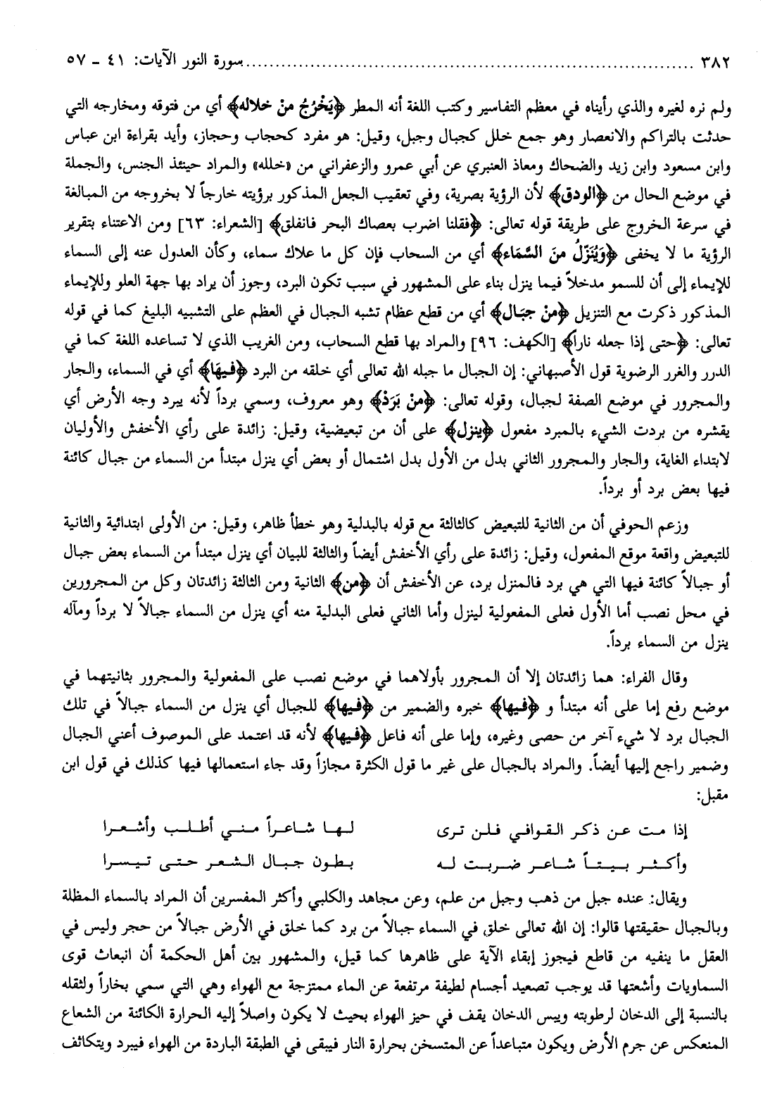 وقال الفراء: هما زائدتان إلا أن المجرور بأولاهما في موضع نصب على المفعولية والمجرور بثانيتهما في موضع رفع إما على أنه مبتدأ وفِيها خبره والضمير من فِيها للجبال أي ينزل من السماء جبالا في تلك الجبال برد لا شيء آخر من حصى وغيره، وإما على أنه فاعل فِيها لأنه قد اعتمد على الموصوف أعني الجبال وضمير راجع إليها أيضا. والمراد بالجبال على غير ما قول الكثرة مجازا وقد جاء استعمالها فيها كذلك في قول ابن مقبل: