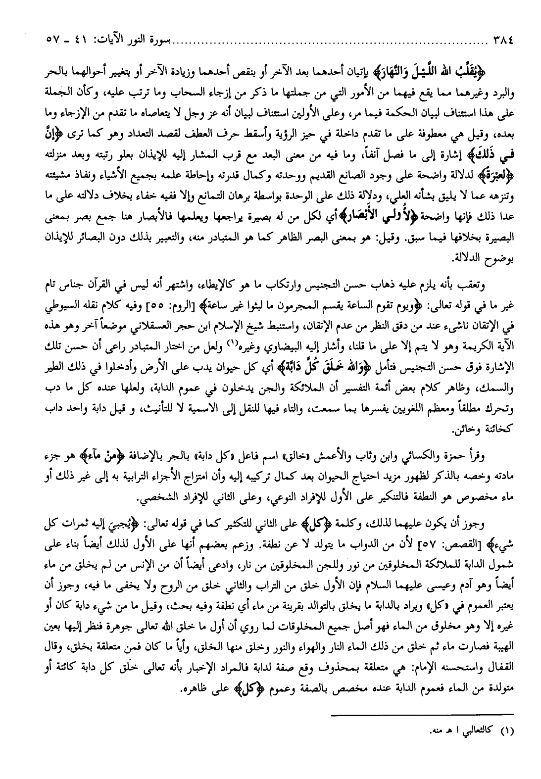 [الروم: 55] وفيه كلام نقله السيوطي في الإتقان ناشىء عند من دقق النظر من عدم الإتقان، واستنبط شيخ الإسلام ابن حجر العسقلاني موضعا آخر وهو هذه الآية الكريمة وهو لا يتم إلا على ما قلنا، وأشار إليه البيضاوي وغيره (¬1) ولعل من اختار المتبادر راعى أن حسن تلك الإشارة فوق حسن التجنيس فتأمل وَاللَّهُ خَلَقَ كُلَّ دَابَّةٍ أي كل حيوان يدب على الأرض وأدخلوا في ذلك الطير والسمك، وظاهر كلام بعض أئمة التفسير أن الملائكة والجن يدخلون في عموم الدابة، ولعلها عنده كل ما دب وتحرك مطلقا ومعظم اللغويين يفسرها بما سمعت، والتاء فيها للنقل إلى الاسمية لا للتأنيث، وقيل دابة واحد داب كخائنة وخائن.