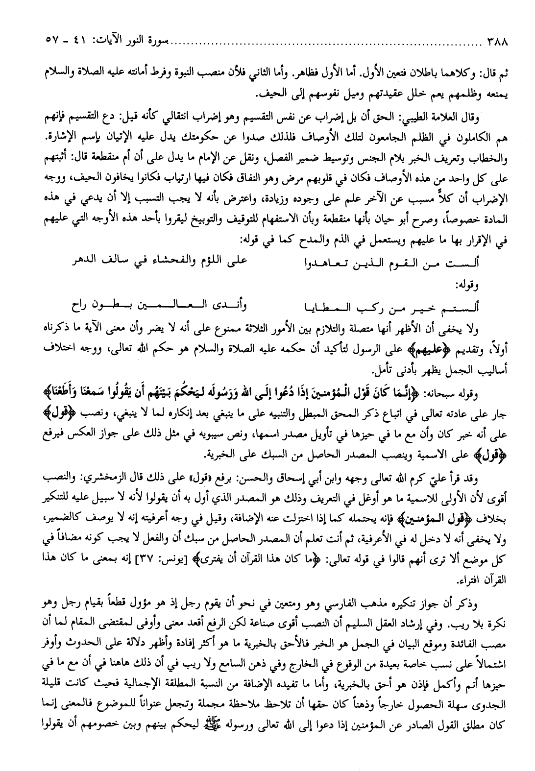 وقوله سبحانه: إِنَّما كانَ قَوْلَ الْمُؤْمِنِينَ إِذا دُعُوا إِلَى اللَّهِ وَرَسُولِهِ لِيَحْكُمَ بَيْنَهُمْ أَنْ يَقُولُوا سَمِعْنا وَأَطَعْنا جار على عادته تعالى في اتباع ذكر المحق المبطل والتنبيه على ما ينبغي بعد إنكاره لما لا ينبغي، ونصب قَوْلَ على أنه خبر كان وأن مع ما في حيزها في تأويل مصدر اسمها، ونص سيبويه في مثل ذلك على جواز العكس فيرفع قَوْلَ على الاسمية وينصب المصدر الحاصل من السبك على الخبرية.