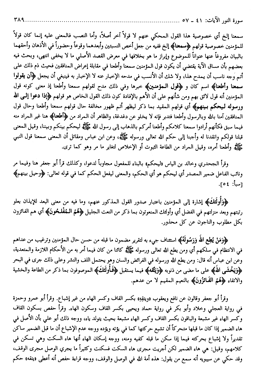 وقرأ أبو جعفر وقالون عن نافع ويعقوب «ويتقه» بكسر القاف وكسر الهاء من غير إشباع. وقرأ أبو عمرو وحمزة في رواية العجلي وخلاد وأبو بكر في رواية حماد ويحيى بكسر القاف وسكون الهاء. وقرأ حفص بسكون القاف وكسر الهاء غير مشبعة والباقون بكسر القاف وكسر الهاء مشبعة بحيث يتولد ياء، ووجه ذلك أبو علي بأن الأصل في هاء الضمير إذا كان ما قبلها متحركا أن تشبع حركتها كما في يؤته ويؤده ووجه عدم الإشباع أن ما قبل الضمير ساكن تقديرا ولا إشباع بحركته فيما إذا سكن ما قبله كفيه ومنه، ووجه إسكان الهاء أنها هاء السكت وهي تسكن في كلامهم، وقيل: هي هاء الضمير لكن أجريت مجرى هاء السكت فسكنت وكثيرا ما يجري الوصل مجرى الوقف، وقد حكي عن سيبويه أنه سمع من يقول: هذه أمة الله في الوصل والوقف، ووجه قراءة حفص أنه أعطى «يتقه» حكم