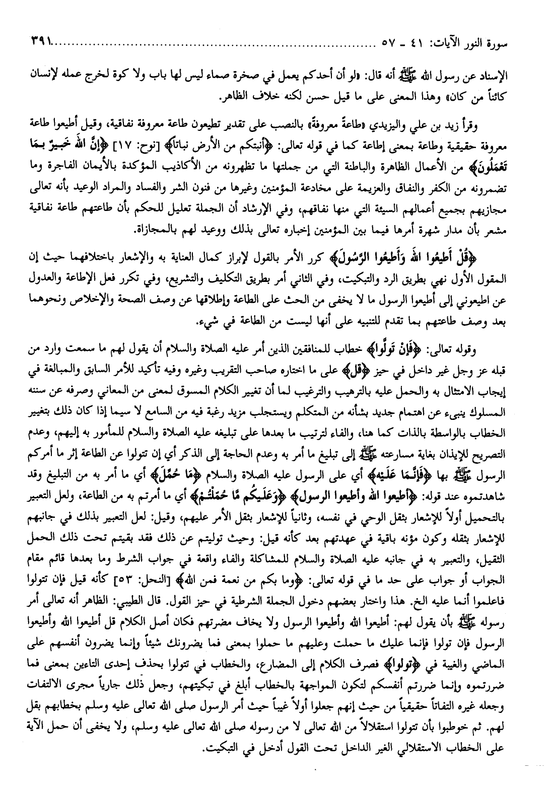 وقوله تعالى: فَإِنْ تَوَلَّوْا خطاب للمنافقين الذين أمر عليه الصلاة والسلام أن يقول لهم ما سمعت وارد من قبله عز وجل غير داخل في حيز قُلْ على ما اختاره صاحب التقريب وغيره وفيه تأكيد للأمر السابق والمبالغة في إيجاب الامتثال به والحمل عليه بالترهيب والترغيب لما أن تغيير الكلام المسوق لمعنى من المعاني وصرفه عن سننه المسلوك ينبىء عن اهتمام جديد بشأنه من المتكلم ويستجلب مزيد رغبة فيه من السامع لا سيما إذا كان ذلك بتغيير الخطاب بالواسطة بالذات كما هنا، والفاء لترتيب ما بعدها على تبليغه عليه الصلاة والسلام للمأمور به إليهم، وعدم التصريح للإيذان بغاية مسارعته صلّى الله عليه وسلّم إلى تبليغ ما أمر به وعدم الحاجة إلى الذكر أي إن تتولوا عن الطاعة إثر ما أمركم الرسول صلّى الله عليه وسلّم بها فَإِنَّما عَلَيْهِ أي على الرسول عليه الصلاة والسلام ما حُمِّلَ أي ما أمر به من التبليغ وقد شاهدتموه عند قوله: أَطِيعُوا اللَّهَ وَأَطِيعُوا الرَّسُولَ وَعَلَيْكُمْ ما حُمِّلْتُمْ أي ما أمرتم به من الطاعة، ولعل التعبير بالتحميل أولا للإشعار بثقل الوحي في نفسه، وثانيا للإشعار بثقل الأمر عليهم، وقيل: لعل التعبير بذلك في جانبهم للإشعار بثقله وكون مؤنه باقية في عهدتهم بعد كأنه قيل: وحيث توليتم عن ذلك فقد بقيتم تحت ذلك الحمل الثقيل، والتعبير به في جانبه عليه الصلاة والسلام للمشاكلة والفاء واقعة في جواب الشرط وما بعدها قائم مقام الجواب أو جواب على حد ما في قوله تعالى: وَما بِكُمْ مِنْ نِعْمَةٍ فَمِنَ اللَّهِ [النحل: 53] كأنه قيل فإن تتولوا فاعلموا أنما عليه إلخ. هذا واختار بعضهم دخول الجملة الشرطية في حيز القول. قال الطيبي: الظاهر أنه تعالى أمر رسوله صلّى الله عليه وسلّم بأن يقول لهم: أطيعوا الله وأطيعوا الرسول ولا يخاف مضرتهم فكان أصل الكلام قل أطيعوا الله وأطيعوا الرسول فإن تولوا فإنما عليك ما حملت وعليهم ما حملوا بمعنى فما يضرونك شيئا وإنما يضرون أنفسهم على الماضي والغيبة في تَوَلَّوْا فصرف الكلام إلى المضارع، والخطاب في تتولوا بحذف إحدى التاءين بمعنى فما ضررتموه وإنما ضررتم أنفسكم لتكون المواجهة بالخطاب أبلغ في تبكيتهم، وجعل ذلك جاريا مجرى الالتفات وجعله غيره التفاتا حقيقيا من حيث إنهم جعلوا أولا غيبا حيث أمر الرسول صلى الله تعالى عليه وسلم بخطابهم بقل لهم. ثم خوطبوا بأن تتولوا استقلالا من الله تعالى لا من رسوله صلى الله تعالى عليه وسلّم، ولا يخفى أن حمل الآية على الخطاب الاستقلالي الغير الداخل تحت القول أدخل في التبكيت.