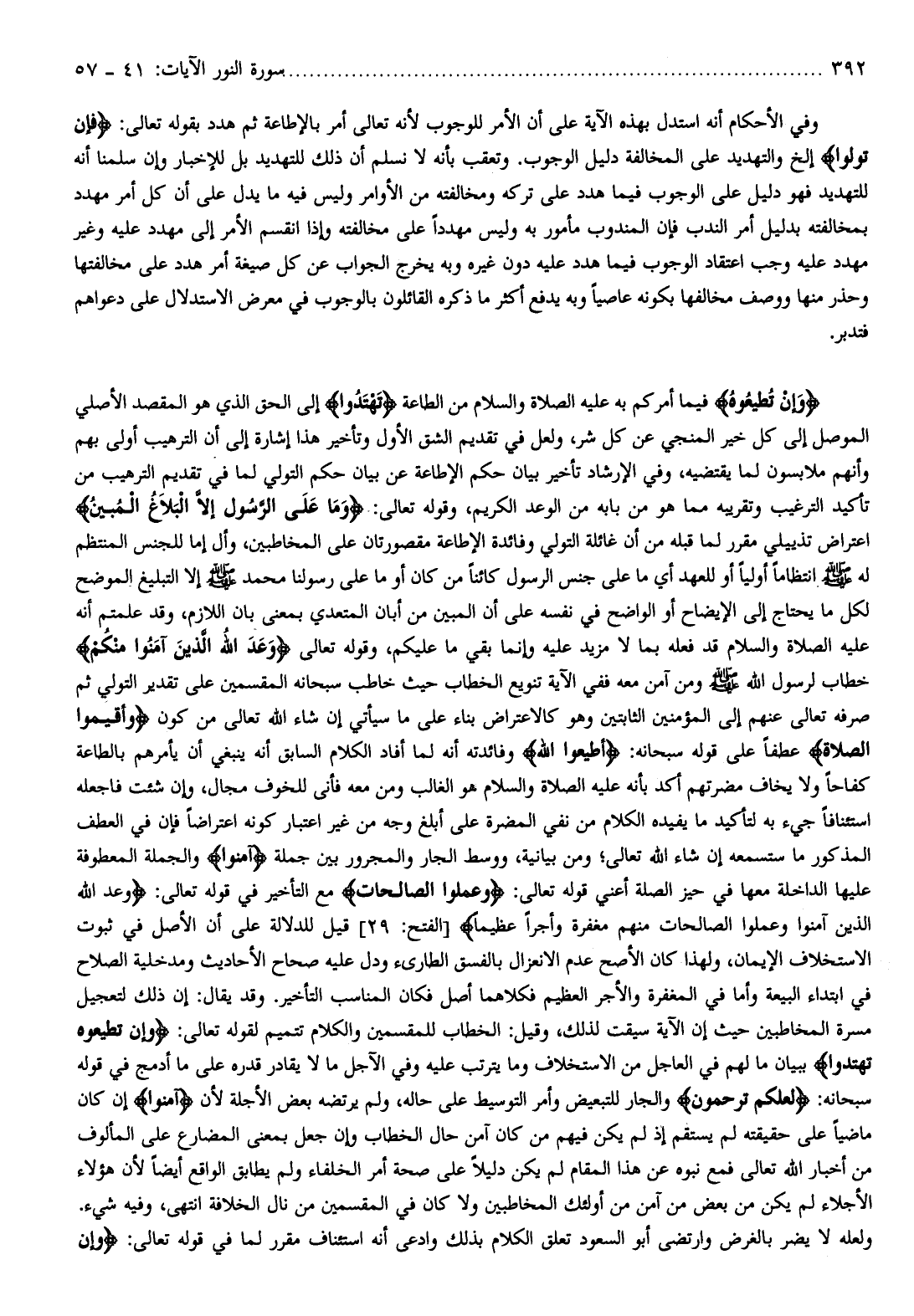 وَإِنْ تُطِيعُوهُ فيما أمركم به عليه الصلاة والسلام من الطاعة تَهْتَدُوا إلى الحق الذي هو المقصد الأصلي الموصل إلى كل خير المنجي عن كل شر، ولعل في تقديم الشق الأول وتأخير هذا إشارة إلى أن الترهيب أولى بهم وأنهم ملابسون لما يقتضيه، وفي الإرشاد تأخير بيان حكم الإطاعة عن بيان حكم التولي لما في تقديم الترهيب من تأكيد الترغيب وتقريبه مما هو من بابه من الوعد الكريم، وقوله تعالى: وَما عَلَى الرَّسُولِ إِلَّا الْبَلاغُ الْمُبِينُ اعتراض تذييلي مقرر لما قبله من أن غائلة التولي وفائدة الإطاعة مقصورتان على المخاطبين، وأل إما للجنس المنتظم له صلّى الله عليه وسلّم انتظاما أوليا أو للعهد أي ما على جنس الرسول كائنا من كان أو ما على رسولنا محمد صلّى الله عليه وسلّم إلا التبليغ الموضح لكل ما يحتاج إلى الإيضاح أو الواضح في نفسه على أن المبين من أبان المتعدي بمعنى بان اللازم، وقد علمتم أنه عليه الصلاة والسلام قد فعله بما لا مزيد عليه وإنما بقي ما عليكم، وقوله تعالى وَعَدَ اللَّهُ الَّذِينَ آمَنُوا مِنْكُمْ خطاب لرسول الله صلّى الله عليه وسلّم ومن آمن معه ففي الآية تنويع الخطاب حيث خاطب سبحانه المقسمين على تقدير التولي ثم صرفه تعالى عنهم إلى المؤمنين الثابتين وهو كالاعتراض بناء على ما سيأتي إن شاء الله تعالى من كون وَأَقِيمُوا الصَّلاةَ عطفا على قوله سبحانه: أَطِيعُوا اللَّهَ وفائدته أنه لما أفاد الكلام السابق أنه ينبغي أن يأمرهم بالطاعة كفاحا ولا يخاف مضرتهم أكد بأنه عليه الصلاة والسلام هو الغالب ومن معه فأنى للخوف مجال، وإن شئت فاجعله استئنافا جيء به لتأكيد ما يفيده الكلام من نفي المضرة على أبلغ وجه من غير اعتبار كونه اعتراضا فإن في العطف المذكور ما ستسمعه إن شاء الله تعالى ومن بيانية، ووسط الجار والمجرور بين جملة آمَنُوا والجملة المعطوفة عليها الداخلة معها في حيز الصلة أعني قوله تعالى: وَعَمِلُوا الصَّالِحاتِ مع التأخير في قوله تعالى: وَعَدَ اللَّهُ الَّذِينَ آمَنُوا وَعَمِلُوا الصَّالِحاتِ مِنْهُمْ مَغْفِرَةً وَأَجْراً عَظِيماً [الفتح: 29] قيل للدلالة على أن الأصل في ثبوت الاستخلاف الإيمان، ولهذا كان الأصح عدم الانعزال بالفسق الطارئ ودل عليه صحاح الأحاديث ومدخلية الصلاح في ابتداء البيعة وأما في المغفرة والأجر العظيم فكلاهما أصل فكان المناسب التأخير. وقد يقال: إن ذلك لتعجيل مسرة المخاطبين حيث إن الآية سيقت لذلك، وقيل: الخطاب للمقسمين والكلام تتميم لقوله تعالى: وَإِنْ تُطِيعُوهُ تَهْتَدُوا ببيان ما لهم في العاجل من الاستخلاف وما يترتب عليه وفي الآجل ما لا يقادر قدره على ما أدمج في قوله سبحانه: لَعَلَّكُمْ تُرْحَمُونَ والجار للتبعيض وأمر التوسيط على حاله، ولم يرتضه بعض الأجلة لأن آمَنُوا إن كان ماضيا على حقيقته لم يستقم إذ لم يكن فيهم من كان آمن حال الخطاب وإن جعل بمعنى المضارع على المألوف من أخبار الله تعالى فمع نبوه عن هذا المقام لم يكن دليلا على صحة أمر الخلفاء ولم يطابق الواقع أيضا لأن هؤلاء الأجلاء لم يكن من بعض من آمن من أولئك المخاطبين ولا كان في المقسمين من نال الخلافة انتهى، وفيه شيء.